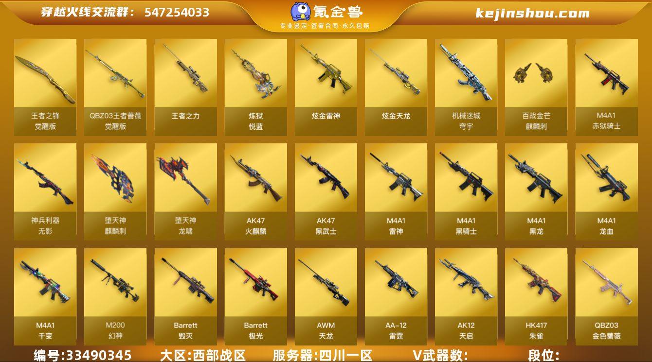 西部战区(四川一区)ys【爆破号】52v【M200-幻神,HK417-朱雀,QBZ03-金色蔷薇,5炼狱,柯尔特-电竞装甲,Colt1911-大黄蜂】4王者【QBZ-03-王者蔷薇,王者之力,王者之锋,炼狱-悦蓝】4炫金【炫金雷神,炫金天龙】3角色【魅影,乔伊教练,王者-瞳-闭月羞花。灵狐者-职业经理】2音效【Barrett-毁灭音效卡,M4A1-黑骑士音效卡】13皮【烈火-动感闪耀,雷神-R.LGD-CFPLS18冠军,雷神-星空,火麒麟-心动糖果,黑骑士-冠军之势,雷神-虎将,火麒麟-CF STAR】【vip5】截图展示段位不代表实际段位 如赛季更新等不可抗拒因素发生变化、时限道具不保证所剩时间