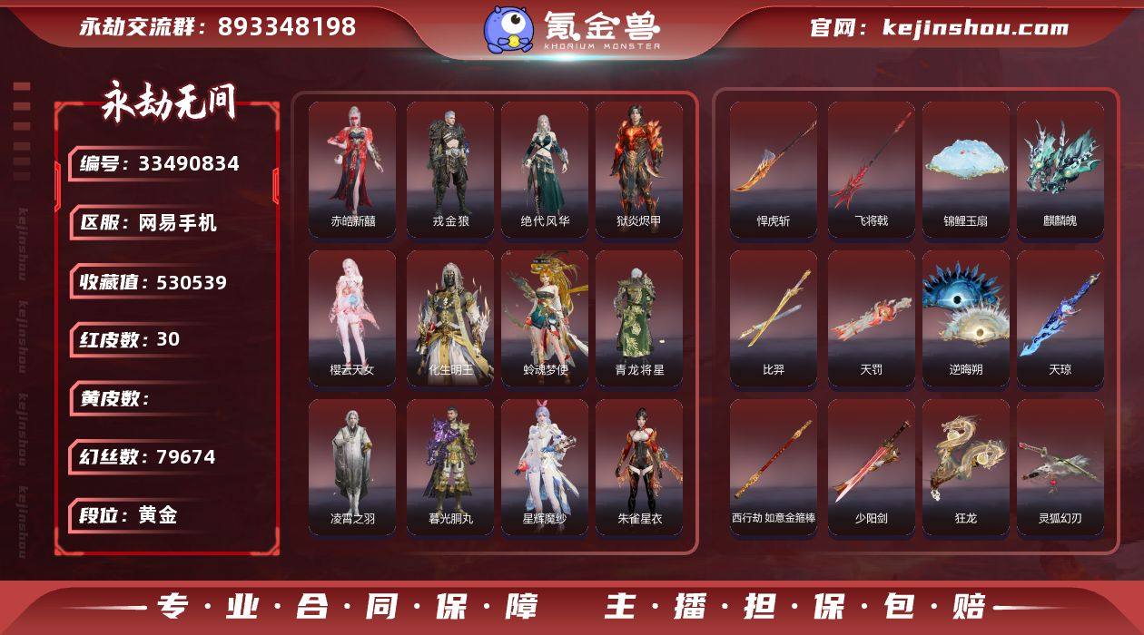 WJ6115,网易手机,5月17可换绑,三人段位黄金5,声望9,30红,639金,等级258,收藏值530539,幻丝79674,金砖10,通行证Lv1,变身器,应龙号,西行劫神君印,雪霜姿,揽九天,霜翎,百战枷锁,2674初代机,珥冰,神乌造像,观山海春木,炎烈珠,红色神品,凌霄之羽,暮光胴丸,绝代风华,星辉魔纱,朱雀星衣,执明神君,流金晓锦,守墨麒,逐光者,画中仙,化生明王,戎金狼,赤皓新囍,狱炎烬甲,樱云天女,阴阳师蛉魂梦使,青龙将星,天罚,麒麟魄,比羿,狼主,悍虎斩,飞将戟,西行劫如意金箍棒,天琼,锦鲤玉扇,逆晦朔,狂龙,少阳剑,灵狐幻刃,角色金色皮肤,喜乐祥羽,黄庭道,梨园传奇柳生,封神录申公豹,司天命,未济袍,禄运玉霄,紫微星命,封神录龙吉公主,自动人形A2,西行劫玄霜仙兔,西行劫玉兔精,砥砺筋骨篮板天才,麟鹿大铠,花之倾奇,拳皇不知火舞,观山海青鸟,西行劫白骨夫人,夏日派对昭夏流金,瀚海苍鹰,福瑞天泽,街头狂欢不败擂主,观山海秋神蓐收,西行劫悟空,斑斓衣,羽影,封神录哪吒,夏日派对盛夏白阳,干将莫邪,护世四法持国天王,武道无穷八极,百战断链,观山海冬神玄冥,无常白袍,云溪仙子,绿野守护悠竹萌客,夏日派对初夏绯莓...