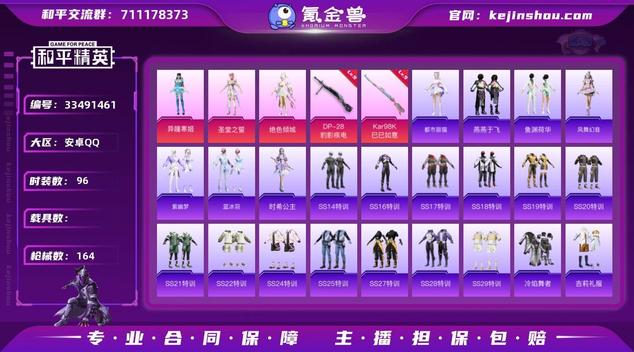 安卓 手Q-3粉装-5特效枪-0载具-3粉色飞行器-44227热力值-5王牌印记-96套装-164枪皮 【粉色套装】:角色-圣堂之誓,角色-绝色倾城,角色-异瞳寒姬 【粉色枪皮等级】:UMP45-萌骑冒险(五级),AKS-74U-森灵之息(五级),Kar98K-巳巳如意(五级),Mk14-福马献瑞(五级),DP-28-豹影疾电(五级) 【粉色枪皮】:UMP45-萌骑冒险,AKS-74U-森灵之息,Kar98K-巳巳如意,Mk14-福马献瑞,DP-28-豹影疾电 【粉色飞行器】:炫彩糖果飞行器,星之彼岸飞行器,黄族统领飞行器 【粉色降落伞】:幻影战神降落伞,星之彼岸降落伞,第五大道降落伞,飒粉甜心降落伞,天星战神降落伞,莲影清波降落伞,猪猪侠降落伞,蜜语绒猫降落伞,金丰海韵降落伞,幻彩电音降落伞,炫彩糖果降落伞 【稀有套装】:套装-炫彩糖果,套装-马上有钱,套装-迅捷龙虾,套装-遗迹猎人,角色-都市丽猫,套装-燕燕于飞,套装-鱼渊荷华,套装-风舞幻音,套装-紫幽梦,套装-蓝冰羽,角色-时希公主,套装-雨过天青,套装-红釉青花 【稀有枪皮】:AUG-冰晶雪宝,AKM-奇异狩猎者,AKM-彩虹符号,AKM-破晓战魂,AKM-龙的传人,M16A4-蓝色火焰,SCAR-L-夜灯,SCAR-L-炫彩节奏,SCAR-L-红色方程式,SCAR-L-绶带小兔,M416-彩虹嘻嘻猴...