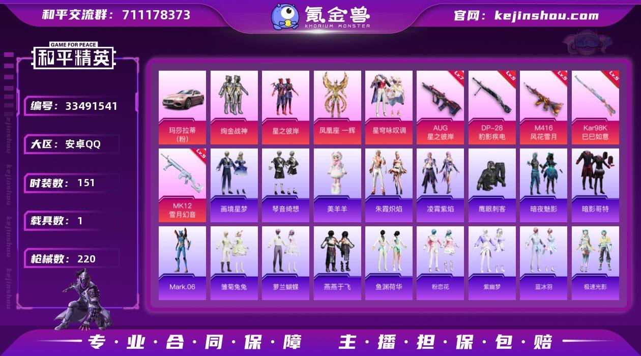 安卓 手Q-5粉装-7特效枪-1载具-2粉色飞行器-61496热力值-4王牌印记-151套装-220枪皮 【热门品类】:套装-暗影哥特,角色-Mark.06 【粉色套装】:粉装-绚金战神,粉装-星之彼岸,角色-凤凰座 一辉,粉装-星穹咏叹调,角色-六号石头人 【粉色枪皮等级】:M416-风花雪月(五级),AUG-星之彼岸(七级),AKS-74U-森灵之息(五级),Kar98K-巳巳如意(五级),Mk14-福马献瑞(五级),MK12-雪月幻音(五级),DP-28-豹影疾电(五级) 【粉色载具】:玛莎拉蒂Ghibli(粉) 【粉色枪皮】:M416-风花雪月,AUG-星之彼岸,AKS-74U-森灵之息,Kar98K-巳巳如意,Mk14-福马献瑞,MK12-雪月幻音,DP-28-豹影疾电 【粉色飞行器】:炫彩糖果飞行器,龙翔九天飞行器 【粉色降落伞】:王牌四分卫降落伞,星之彼岸降落伞,镜域双华降落伞,星穹咏叹调降落伞,炫彩糖果降落伞 【稀有套装】:套装-雪国风尚,套装-炫彩糖果,套装-马上来财,套装-迅捷龙虾,套装-雏菊兔兔,套装-萝兰蝴蝶,套装-燕燕于飞,套装-鱼渊荷华,套装-粉恋花,套装-紫幽梦,套装-蓝冰羽,套装-极速光影,套装-彩虹兔,套装-云朵鹅,套装-雪绒豹,套装-混沌火种,角色-绛羽幽主,套装-朱霞炽焰,套装-凌霄紫焰,玩偶服-美羊羊,套装-画境...
