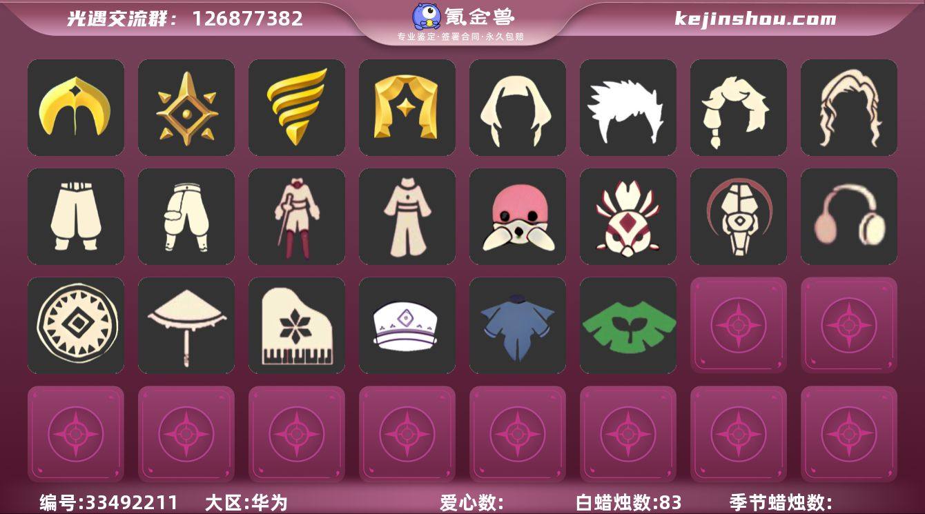 [18777029]华为 手机账号 3珍稀物品 4毕业季 5毕业图 83蜡烛 【珍稀物品】白枭(帝企鹅发),阿努比斯(狗头),鳐鲲斗篷 【季节已毕业】圣岛季,预言季,潜海季,表演季 【完成地图】晨岛,雨林,霞谷,墓土(暮土),禁阁 【礼包】姆明饰品套装(姆明尾巴),满月耳坠,鹿角(圣诞鹿角),围巾(小王子斗篷)(小王子围巾),蝙蝠套(蝙蝠斗篷)(南瓜头) 【裤子】王子服(小王子套装),武士裤,搓澡巾,击剑裤 【面具】黄眉企鹅面具,呼吸面具(潜水面具),阿努比斯,凤凰面具 【面饰】红耳机 【发型】小王子发型,单侧绑发(单边小辫),留辫蘑菇头,虚荣,若笠(箬笠) 【头饰】平顶帽,蓝色音乐会(蓝色音乐符) 【斗篷】燕尾斗篷,黄色蓑衣(道袍),绿芽 【配饰】蓝色手碟(毕业手碟),圆鼓(手拍大鼓),雨伞,高音钢琴(白色高脚钢琴)