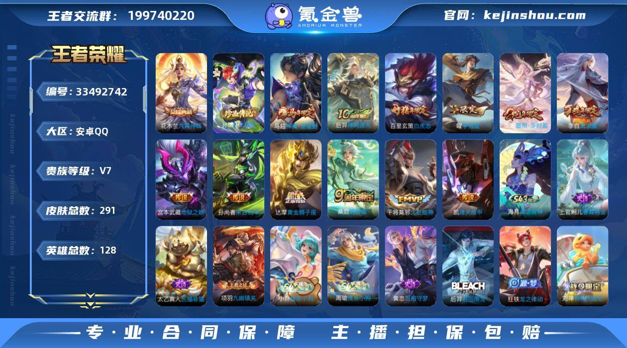 【Hwz1290】【特价出售】安卓Q-V7可二次-128英雄-291皮肤-1典藏皮肤-1珍品传说-12传说-77史诗(九霄神辉、时之奇旅、白虎志、凤求凰) 【荣耀典藏】:花木兰九霄神辉 【珍品传说】:孙策时之奇旅 【传说皮肤】:马超神骥逐星野,后羿神树通天,虞姬愿照岁时盈,桑启鸣野蒿,曜李逍遥 ,铠绛天战甲,干将莫邪久胜战神,达摩黄金狮子座,百里玄策白虎志,李白凤求凰,孙尚香末日机甲,宫本武藏地狱之眼 【限定皮肤】:姜子牙天穹之誓,杨戬破阵退雄兵,狄仁杰阴阳师,赵云皇家上将,墨子神迹守卫,孙尚香蔷薇恋人,高渐离玩趣恶龙,阿轲迷踪丽影,芈月幻夜卜梦,元歌云间偶戏,元歌无心,夏侯惇朔风刀,狄仁杰魔术师,狄仁杰万华元夜,达摩沙漠行僧,项羽海滩派对,老夫子醍醐杖,老夫子航海奇遇记,程咬金演武夺筹,刘邦夺宝奇兵,兰陵王金庭之子,亚瑟潮玩骑士王,后羿圣弓游侠,李元芳云中旅人,钟馗驱傩正仪,干将莫邪真爱魔法,雅典娜单词大作战,鬼谷子原初探秘者,鬼谷子五谷丰年,黄忠火炮绅士,苏烈千军破阵,百里玄策白虎志,百里玄策原初追逐者,弈星混沌棋,沈梦溪大漠名商,明世隐疑决卦,裴擒虎李小龙,裴擒虎擒涛扼浪,米莱狄御霄,云中君纤云弄巧,盾山御銮,猪...