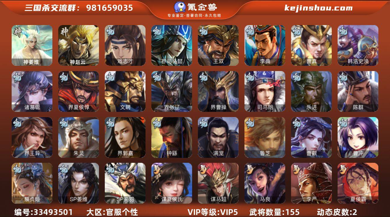 【14790199】官阶:先锋将军;VIP等级:VIP5;史诗武将数量:6;动态皮肤数量:2;武将总数:155;史诗宝珠数量:0;将魂数量:795;神将:2;魏国史诗武将:2;蜀国史诗武将:2;吴国史诗武将:1;群史诗武将:0