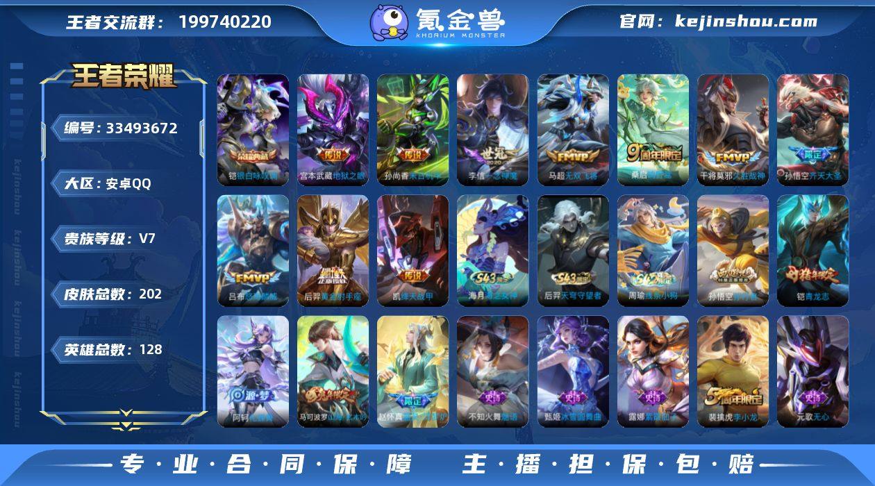 【mwz426】安卓Q-V7-永恒钻石III段位-128英雄-202皮肤-1典藏皮肤-10传说-56史诗 【英雄全皮】:孙权全皮 【荣耀典藏】:铠银白咏叹调 【传说皮肤】:桑启鸣野蒿,孙悟空齐天大圣,吕布怒海麟威,马超无双飞将,铠绛天战甲,李信一念神魔,干将莫邪久胜战神,后羿黄金射手座,孙尚香末日机甲,宫本武藏地狱之眼 【限定皮肤】:狄仁杰阴阳师,赵云皇家上将,墨子神迹守卫,孙尚香蔷薇恋人,庄周高山流水,钟无艳超时空战士,元歌无心,甄姬落雪兰心,马可波罗山海玄木吟,狄仁杰魔术师,狄仁杰万华元夜,项羽海滩派对,老夫子醍醐杖,老夫子航海奇遇记,程咬金演武夺筹,兰陵王金庭之子,孙悟空孙行者,孙悟空齐天大圣,李元芳云中旅人,钟馗驱傩正仪,干将莫邪胡桃夹子,雅典娜单词大作战,鬼谷子原初探秘者,鬼谷子五谷丰年,铠青龙志,百里玄策原初追逐者,弈星混沌棋,沈梦溪大漠名商,裴擒虎李小龙,裴擒虎擒涛扼浪,云中君纤云弄巧,嫦娥暖冬兔眠,西施玲珑珍味,蒙犽狂想玩偶喵,鲁班大师探海日志,桑启海盐诗旅,暃星界游侠,戈娅驭风魔法,阿古朵江河有灵,张良古海寻踪,蒙犽百解令,鬼谷子天穹祈灯,沈梦溪龙舞盛年,刘邦剑破天穹 【年限皮肤】:铠青龙志,马可波罗...