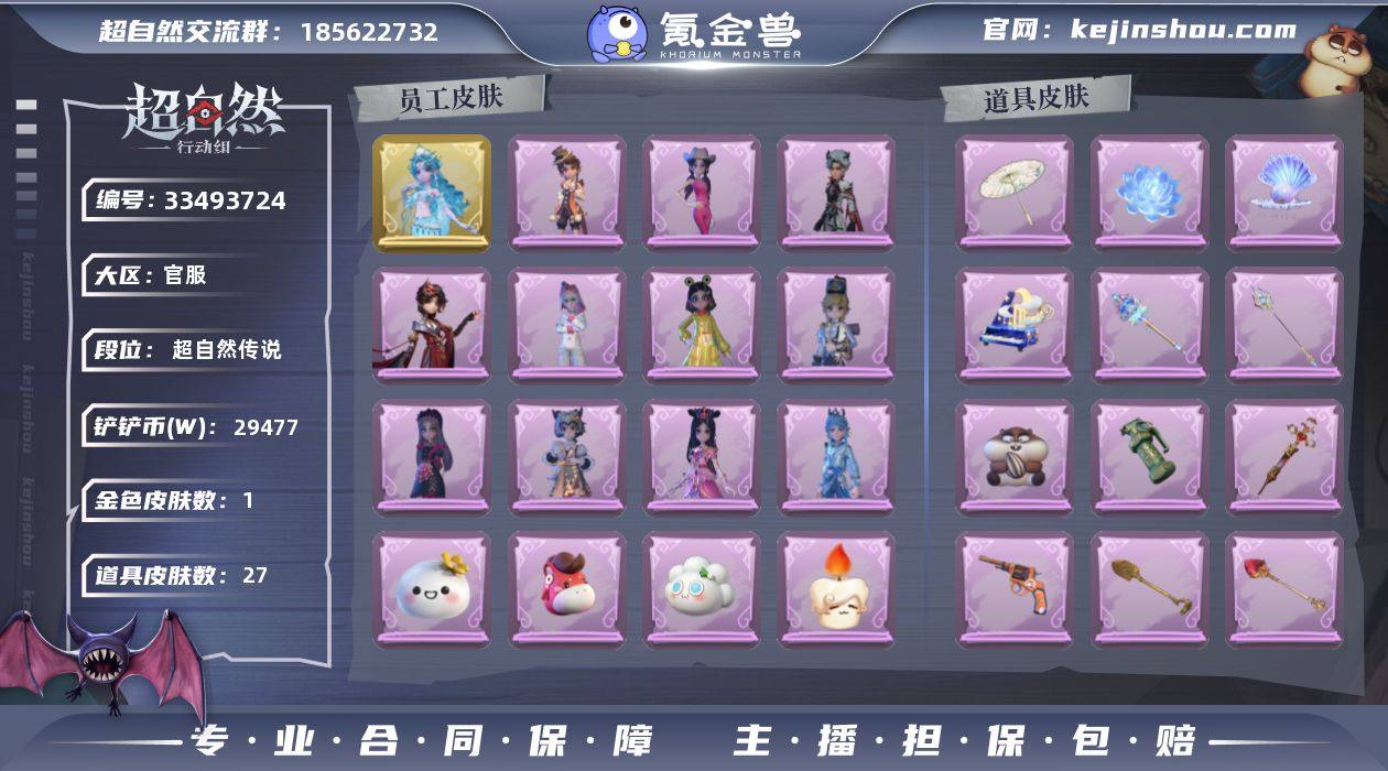 金皮1;紫皮11;道具皮27;皮肤:薇薇安-海月息潮,艾伦-黎明猎手,小黄-罗丽,艾伦-水王子,阿念-庆宴绮愿,爱丽丝-耀眼的你,薇薇安-仙锋小姐,艾伦-绒绒对决,爱丽丝-丝缕哀歌,阿念-王子与骑士,小黄-霓裳踏雪,小黄-呱呱雨衣;道具:专业手电-星寂,铲子-圣心之泪,葫芦-海心凝珠,短管猎枪-星光的裁决,喷气背包-乘风溯雪,电击枪-权杖的许诺,长鞭-缚誓之锁,转轮手枪-新星时代,铲子-龙鳞,长枪-波塞冬,腰包-红运福虎,音响-鸣沙鼓,音响-月光奏鸣曲,腰包-私藏的银河,急救包-土拨鼠捏捏,传送按钮-幻宠之门,急救包-末章心跳,黄牛能量饮料-雪顶奇愿,夜视仪-金丝眼镜,摸金符-花落精绝,伞-郁金春信,除颤仪-冰晶般的代价,急救包-蔷薇物语,腰包-宝剑八,闪光弹-金戈玄铜,摸金符-祝祷词,伞-伞;饰品:头饰-樱桃奶油布丁,头饰-小狗蛇点点头套,头饰-炙热烧烤,头饰-驼半仙头套,头饰-卑微头套,头饰-芝麻糊汤圆,头饰-蒜了八,头饰-滑稽头套,头饰-嘻嘻头套,头饰-面具马头套,头饰-火爆了头套,头饰-大葱明头套,头饰-烈焰红唇头套,头饰-呆滞头套,头饰-马上有钱,头饰-太空鲨头套,头饰-萨卡班甲鱼头套,头饰-饺饺者头套,头饰-惊魂南瓜头套,头饰-烛光纪念,头饰-鱼头怪头套,头饰-哈士奇头套,头饰-后室幸存者头套,头...