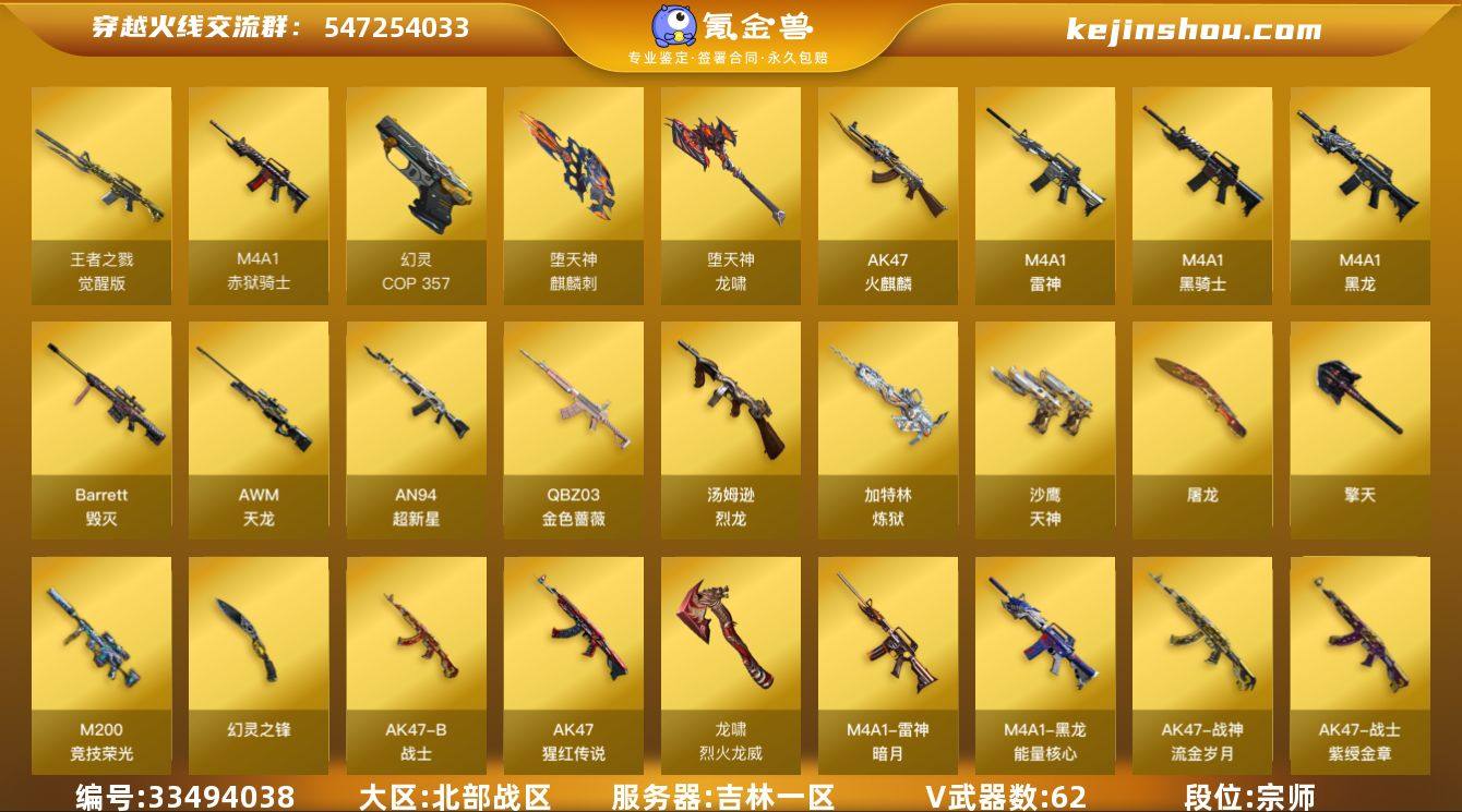 吉林一区-68V-1王者武器数-0炫金武器数 【热门武器】:QBZ03-金色蔷薇,M200-竞技荣光,M4A1-黑骑士,汤姆逊-烈龙,加特林-炼狱,雷神-小红,COP 357-幻灵,金刚伞 【音效卡】:M4A1-黑骑士音效卡 【皮肤】:雷神-暗月,火麒麟-心动糖果,毁灭耀金皮肤,黑龙-能量核心*2,战神-粉色甜心皮肤,战神-紫绶金章皮肤,战神-流金岁月皮肤 【角色】:葵,迷迭香,影豹,电竞教官-云悠悠,暗夜-X,初恋灵狐,芳心审判者,嘉年华灵狐,灵狐者-X,麻雀,曼陀罗-X,潘多拉-X,潘多拉-甜心教官,斯沃特-X,蜀雪,影武者-X,潘多拉-N 【人偶武器】:雷神-小红,巴雷特-零-水下丽影,AWM-灵狐-15周年嘉年华,M37-葵,夺魂 【暴走生化】:超级对讲机 【挑战大师】:激光毁灭者III,机甲撕裂者III 【英雄级武器】:AK47-火麒麟*2,M4A1-黑龙,M4A1-雷神,M4A1-黑骑士,AN94-超新星,QBZ03-金色蔷薇,王者之戮-觉醒版,AK-47-猩红传说*3,AK47-B-战士,AWM-天龙,Barrett-毁灭,M200-竞技荣光,Barrett-金色蔷薇,加特林-炼狱,汤姆逊-烈龙,沙鹰-天神,COP 357-幻灵,屠龙*4,麒麟刺-堕天神,擎天,幻灵之锋*2,龙啸-堕天神,龙啸-烈火龙威,高爆手雷-堕天神*4,高爆手雷-幻灵*5,高爆手雷-竞...