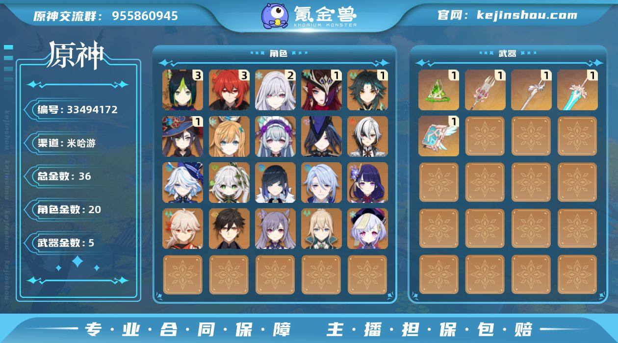 邮箱: 未绑定 总黄数: 36 冒险等级: 60 3命金色角色: 三命迪卢克,三命提纳里 2命金色角色: 二命丝柯克 1命金色角色: 一命莫娜,一命魈,一命恰斯卡 0命金色角色: 枫原万叶,七七,刻晴,钟离,琴,雷电将军,神里绫人,夜兰,纳西妲,芙宁娜,阿蕾奇诺,克洛琳德,梦见月瑞希,爱可菲 拥有武器: 天空之卷,天空之傲,风鹰剑,香韵奏者,真语秘匣 1精武器: 天空之卷,天空之傲,风鹰剑,香韵奏者,真语秘匣 亮点: 【sy181】60级/36黄/男主/20个五星角色/5个五星武器0命克洛琳德,0命阿蕾奇诺,0命芙宁娜,0命纳西妲,3命提纳里,0命夜兰,0命神里绫人,0命雷电将军,0命枫原万叶,0命钟离,1命魈,0命刻晴,0命七七,0命琴,1命莫娜,3命迪卢克,1命恰斯卡,0命梦见月瑞希,0命爱可菲,2命丝柯克,精1天空之卷,精1风鹰剑,精1天空之傲,精1香韵奏者,精1真语秘匣