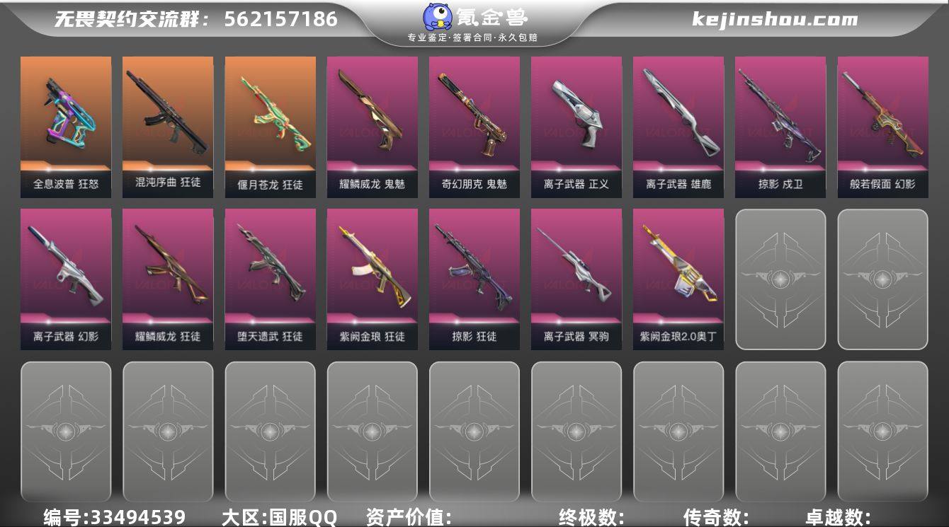 【套装】:西部未来套装,离子武器套装,耀鳞威龙套装,掠影套装,般若假面//2.0套装 【英雄】:炼狱,维斯,暮蝶,钛狐,壹决,铁臂,捷风,雷兹,幽影,不死鸟,贤者,猎枭,蝰蛇,零,芮娜,奇乐,尚勃勒,霓虹,斯凯,夜露,星礈,K/O,海神,盖可,黑梦,钢锁 【近战武器】:近战武器-RGX 11z Pro//3.0 爪刀,近战武器-威龙之刃,近战武器-鬼丸国纲,近战武器-未来开拓者,近战武器-离子武器 能量剑,近战武器-超能偶像 应援棒,近战武器-超限闪存 匕首,近战武器-钢轨卫士 战锤,近战武器-荒土机兵 热能刀,近战武器-沙尘幻旅 匕首,近战武器-影刃,近战武器-神圣领域 战刀 【狂徒】:狂徒-混沌序曲,狂徒-全息波普//2.0,狂徒-偃月苍龙,狂徒-创·纪元,狂徒-般若假面//2.0,狂徒-堕天遗武,狂徒-掠影,狂徒-耀鳞威龙,狂徒-紫阙金琅,狂徒-超能偶像,狂徒-钢轨卫士,狂徒-荒土机兵,狂徒-沙尘幻旅 【幻影】:幻影-西部未来,幻影-般若假面,幻影-离子武器,幻影-超限闪存,幻影-神圣领域,幻影-聚合之力,幻影-纳米打击,幻影-战术小伙伴,幻影-西部未来 【戍卫】:戍卫-掠影,戍卫-超能偶像,戍卫-钢轨卫士,戍卫-浮光跃金,戍卫-萌彩剪影,戍卫-逆冲蛮牛,戍卫-月球...