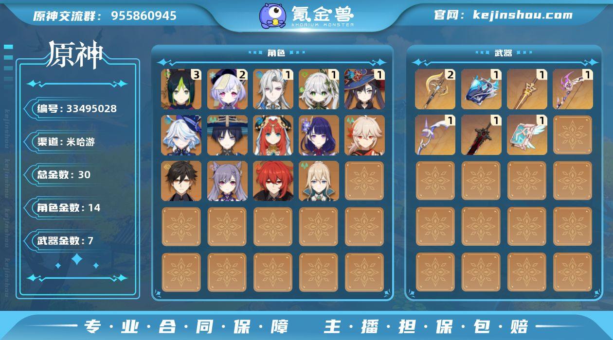 59级/30黄/男主/14个五星角色/7个五星武器/芙宁娜/钟离/一命那维莱特/枫原万叶/流浪者/雷电将军/一命纳西妲/三命提纳里/妮露/一命莫娜/二命七七/琴/刻晴/迪卢克/飞雷之弦振/万世流涌大典/圣显之钥/狼的末路/阿莫斯之弓/天空之卷/裁断