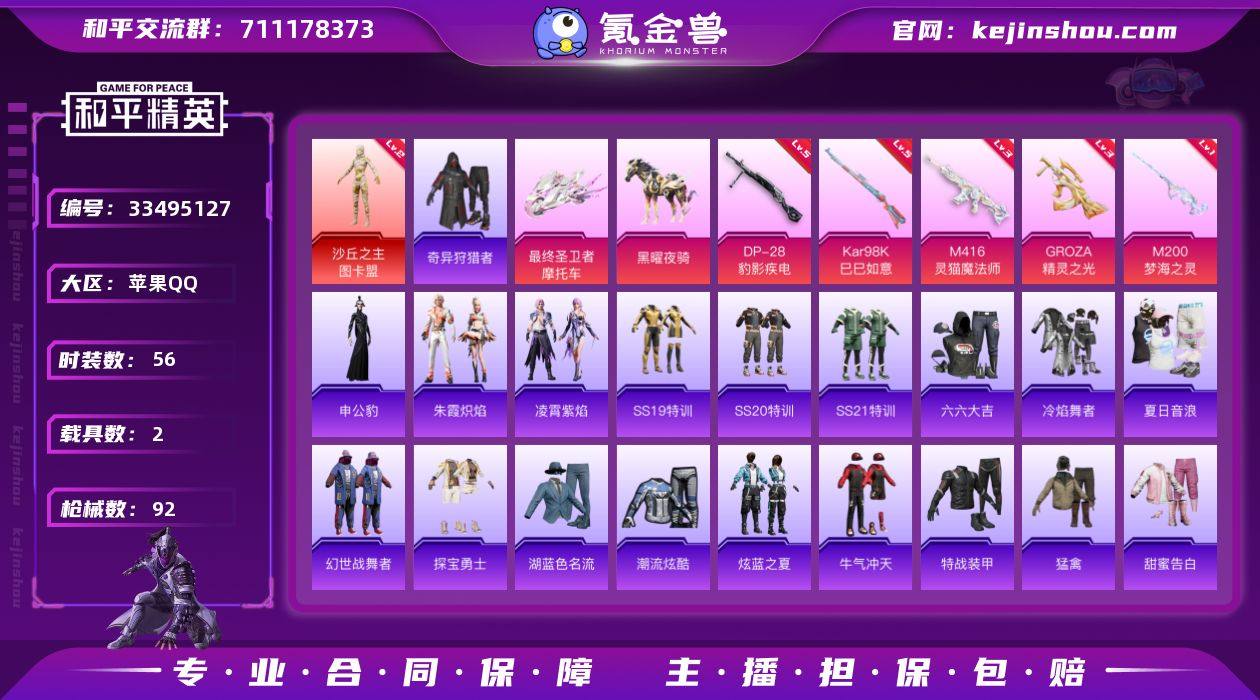 苹果 手Q-1神装-1粉装-8特效枪-2载具-6粉色飞行器-29602热力值-1王牌印记-56套装-92枪皮 【红色神装等级】:沙丘之主-图卡盟(二级) 【红色角色神装】:沙丘之主-图卡盟 【热门品类】:套装-奇异狩猎者 【粉色套装】:角色-虎痴许褚 【粉色枪皮等级】:M416-灵猫魔法师(三级),GROZA-精灵之光(三级),UMP45-萌骑冒险(四级),AKS-74U-森灵之息(四级),Kar98K-巳巳如意(五级),Mk14-福马献瑞(五级),M200-梦海之灵(一级),DP-28-豹影疾电(五级) 【粉色载具】:最终圣卫者摩托车,黑曜夜骑 【粉色枪皮】:M416-灵猫魔法师,GROZA-精灵之光,UMP45-萌骑冒险,AKS-74U-森灵之息,Kar98K-巳巳如意,Mk14-福马献瑞,M200-梦海之灵,DP-28-豹影疾电 【粉色飞行器】:香车宝马飞行器,沙丘之主天马,幻海精灵飞行器,曦光华影飞行器,终晖之翼飞行器,灵猫魔法师飞行器 【粉色降落伞】:精灵之光降落伞,最终圣卫者降落伞 【稀有套装】:套装-马上有钱,套装-朱霞炽焰,套装-凌霄紫焰,角色-申公豹,套装-雨过天青,套装-红釉青花 【稀有枪皮】:AKM-奇异狩猎者,AKM-影袭,M16A4-幻世战舞者,M16A4-甜心亚梦,SCAR-L-炫彩节奏,SCAR-L-红色方程式,M416-红色方程式,GROZA-影袭,QBZ-彩...