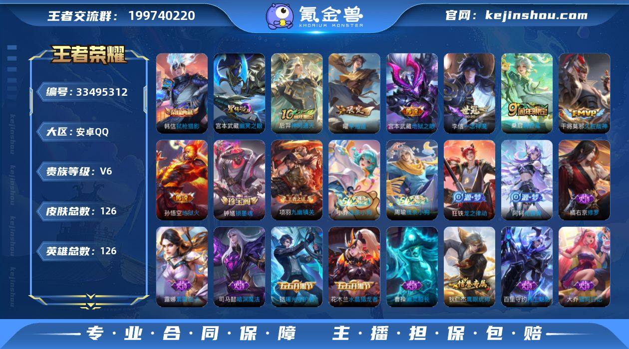 安卓Q-V6-永恒钻石IV段位-126英雄-126皮肤-1典藏皮肤-7传说-28史诗 【英雄全皮】:孙权全皮,影全皮 【荣耀典藏】:韩信弑枪猎影 【传说皮肤】:后羿神树通天,桑启鸣野蒿,曜李逍遥 ,李信一念神魔,干将莫邪久胜战神,宫本武藏地狱之眼,孙悟空地狱火 【限定皮肤】:蒙犽顽岩魄,姜子牙天穹之誓,狄仁杰阴阳师,赵云皇家上将,高渐离玩趣恶龙,狄仁杰魔术师,狄仁杰万华元夜,项羽海滩派对,老夫子醍醐杖,程咬金演武夺筹,李元芳云中旅人,钟馗驱傩正仪,鬼谷子原初探秘者,弈星混沌棋,曜李逍遥 ,桑启海盐诗旅,张良古海寻踪,鬼谷子天穹祈灯,沈梦溪龙舞盛年,刘邦剑破天穹,周瑜熔金海岸 【赛季限定】:弈星混沌棋,老夫子醍醐杖,鬼谷子原初探秘者,狄仁杰万华元夜,程咬金演武夺筹,钟馗驱傩正仪,李元芳云中旅人,桑启海盐诗旅,张良古海寻踪,鬼谷子天穹祈灯,刘邦剑破天穹,姜子牙天穹之誓,东皇太一噬灭天穹,太乙真人谧流熔炉,钟馗虚灵犬护,亚瑟荣光之誓,牛魔星界战将,项羽九幽镇关 【战令限定】:周瑜线条小狗,小乔线条小狗 【史诗皮肤】:钟馗锁墨魂,周瑜线条小狗,小乔线条小狗,项羽九幽镇关,狂铁龙之律动,阿轲化蝶舞,牛魔星界战将,蒙犽顽岩魄,...