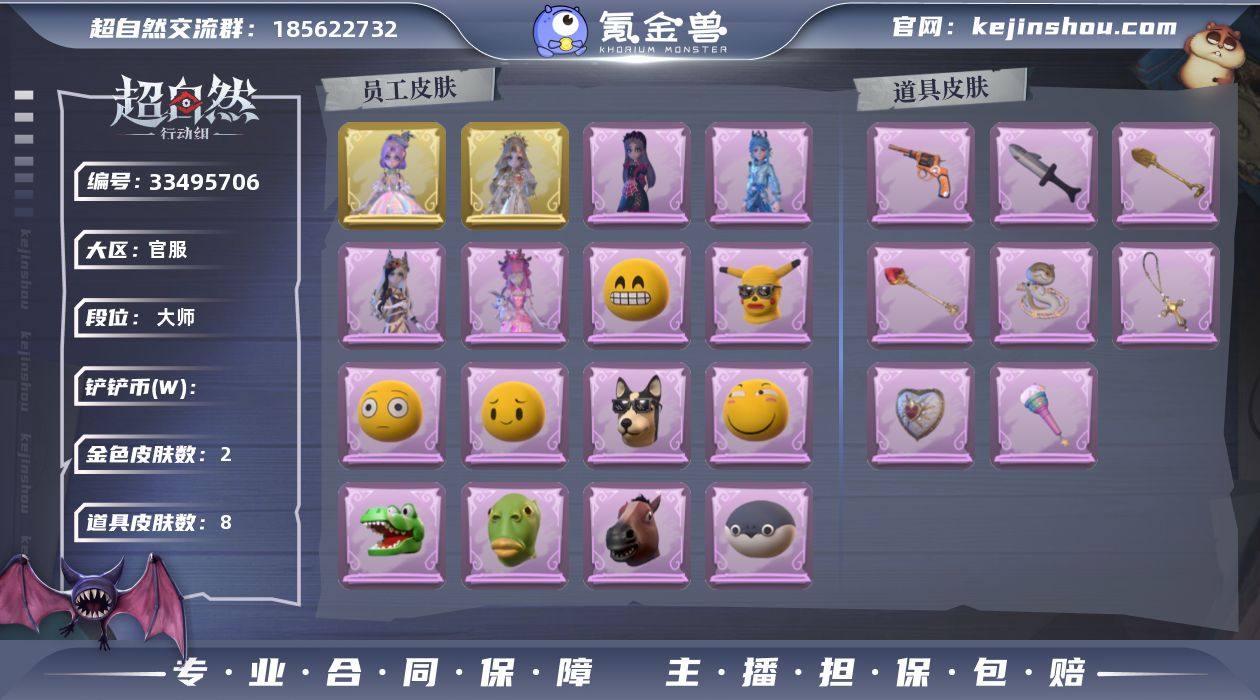 金皮2;紫皮4;道具皮8; 皮肤:小黄-遗失的童话,薇薇安-圣光之谕,莉莉-情公主,薇薇安-白光莹,艾伦-水王子,爱丽丝-丝缕哀歌; 道具:长鞭-小狗蛇点点鞭,铲子-圣心之泪,专业手电-云端梦想计划,腰包-宝剑八,转轮手枪-新星时代,摸金符-祝祷词,铲子-龙鳞,刺刀-小鲨匕首; 饰品:头饰-鳄霸天头套,头饰-哈士奇头套,头饰-小狗蛇点点头套,头饰-烈焰红唇头套,头饰-卑微头套,头饰-萨卡班甲鱼头套,头饰-滑稽头套,头饰-呆滞头套,头饰-嘻嘻头套,头饰-鱼头怪头套,头饰-面具马头套,头饰-像素朋克墨镜,头饰-后室幸存者头套 ,挂饰-小鲨包包,挂饰-未竟乐园,挂饰-天使消失的年代, 背饰-天使的呼唤,背饰-牛啤背包; 动作:动作-舞台中心,动作-萨克斯律动舞,动作-心跳摇,动作-九万字舞,动作-姬芽摇,动作-旋转舞,动作-举牌,动作-抬手; 工牌背景:工牌背景-点点萌伴,工牌背景-圣光之誓,工牌背景-雷霆轩,工牌背景-蓝海奇遇,工牌背景-情语塔,工牌背景-花蕾城堡;工牌动作:工牌动作-元气剪刀手,工牌动作-虔诚之姿; 员工:零,员工-艾伦,员工-薇薇安,员工-兰,员工-爱丽丝,员工-小黄,员工-爱德华,员工-莉莉; ,密保手机