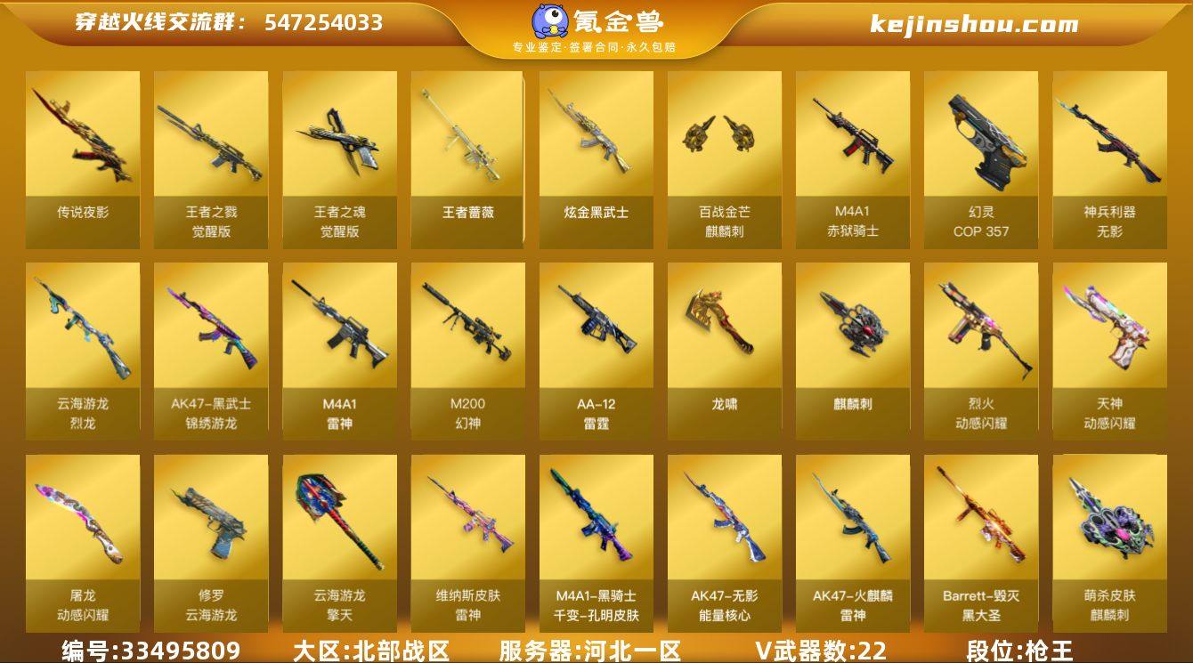 【CF2201】【双全号/传说夜影,M200-幻神,金色小号,炼狱-迷你小钢,COP-白鲨,COP 357-幻灵】河北一区-26V-3王者-1炫金 【传说武器】:传说夜影 【热门武器】:传说夜影,M200-幻神,金色小号,炼狱-迷你小钢,COP-白鲨,COP 357-幻灵 【王者炫金武器】:王者蔷薇,炫金武士 【音效卡】:烈龙-云海游龙音效卡,HK417-朱雀音效卡,炼狱-百战金芒-庆典舞曲音效卡 【皮肤】:雷神-维纳斯皮肤,雷神-源计划2.0专属 皮肤,M4A1-再燃火线,火麒麟-雷神,毁灭-黑大圣皮肤,M4A1-千变-孔明皮肤,无影-能量核心,极光-能量核心,修罗耀金皮肤,修罗-星空,轻型军用手斧-再燃火线,麒麟刺-萌杀皮肤 【角色】:樱,隼,乔伊教练,云海玲珑,暗夜-X,芳心审判者,飞虎队-X,嘉年华灵狐,娟娟,0号玩家,麻雀,曼陀罗-X,潘多拉-X,潘多拉-甜心教官,潜龙队-X,青霞仙子,赛斯-X,蜀雪,新娜塔莎 【人偶武器】:COP-白鲨,炼狱-迷你小钢,迷你宝贝,AWM-灵狐-15周年嘉年华*2,迷你深渊冰龙,迷你牛魔王,迷你波特博士,迷你牛牛,迷你生化手雷,生化手雷-机甲核心*2,深渊终结者手雷*2 【暴走生化】:双面神,超级对讲机 【挑战大师】:冰龙粉碎者-白马银枪,激光毁灭者III-白马银枪,激...