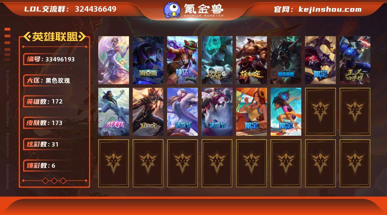 t39496【黑色玫瑰】 173皮肤 31炫彩 6臻彩 5神话/18限定/13传说/172英雄 账号等级:460 单双排段位:铂金 【重要头像】心型钥匙 击拳 小茹 【重要皮肤】海克斯科技魔腾 胜利之王泰达米尔 胜利巨口克格莫 张辽文远 胜利之树茂凯 胜利枪神卢锡安 水晶玫瑰阿克尚 冰雪女神辛德拉 魄罗骑士瑟庄妮 泳池派对塔莉垭 泳池派对蕾欧娜 FPX薇恩 冰雪兽纳尔 防暴天使凯尔 圣诞老人古拉加斯 暗影沃里克 都铎王朝图奇 十五周年纪念希维尔 十周年纪念安妮 源代码乐芙兰 神凰行者瑞羽圣凰艾尼维亚 胜利凤凰艾尼维亚 暗裔英雄盖伦 大元素使拉克丝 绝息圣堂洛 【传说皮肤】霸天零式赛恩 黎明使者索拉卡 日蚀骑士希维尔 女校长菲奥娜 绅士科加斯 死亡骑士盖伦 女皇艾希 黑夜使者亚索 合金巨兽努努和威朗普 焰尾妖狐阿狸 金牌主播德莱文 第三类接触黑默丁格 大天使长米迦勒凯尔 【重要炫彩】无畏骑士瑟庄妮赤子初心 灵魂莲华亚索霜见 可爱可爱粉红红布里茨 星之吞噬者莫甘娜热情之末 幻灵战斗兔锐雯梦幻强袭