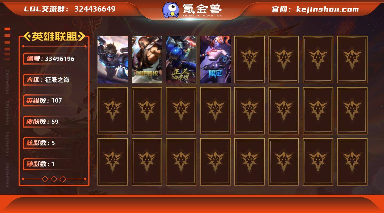 未定级段位-107英雄-59皮肤-5炫彩-1终极-0神话-6限定-6传说-21史诗 【臻彩皮肤】:红莲之刃锐雯 【冰雪限定】:阿木木“主人不要我了”,夺命美人卡特琳娜 【终极皮肤】:未来战士伊泽瑞尔 【限定皮肤】:暗杀星奥莉安娜,大魔王提莫,野兽猎人德莱文,防暴天使凯尔 【传说皮肤】:源计划林易,绅士科加斯,地狱行者孙悟空,黎明使者锐雯,泳池派对吉格斯,黑夜使者亚索 【史诗皮肤】:天人合一易,铁血剑豪易,血石诅咒塔里克,绝代智将斯维因,前线指挥官卡特琳娜,枯萎之壤雷克顿,至高之拳李青,地下拳王李青,血色之锤波比,兔女郎锐雯,腥红之月鬼武者慎,星际迷航拉克丝,银河魔装机神菲兹,驯龙女巫璐璐,死亡绽放卡兹克,西部牛仔亚索,源计划风亚索,腥红之月亚索,银河魔装机神千珏,腥红之月锤石,虚空使者俄洛伊 【王者皮肤】:星空之门内瑟斯 【勇士皮肤】:亮丽女神希维尔 【典藏皮肤】:法老阿木木 【其他皮肤】:小红帽安妮,弗拉基米尔伯爵,黑暗骑士阿利斯塔,约德尔海贼团崔丝塔娜,勇敢的心艾希,黑暗骑士艾希,勇敢的心泰达米尔,嘻哈精神基兰,铬金铠甲拉莫斯,冰壶选手维迦,冒险精神伊泽瑞尔,足球宝贝阿卡丽,刺身之拳阿卡丽,战神阿瑞斯盖伦,黄金骑...