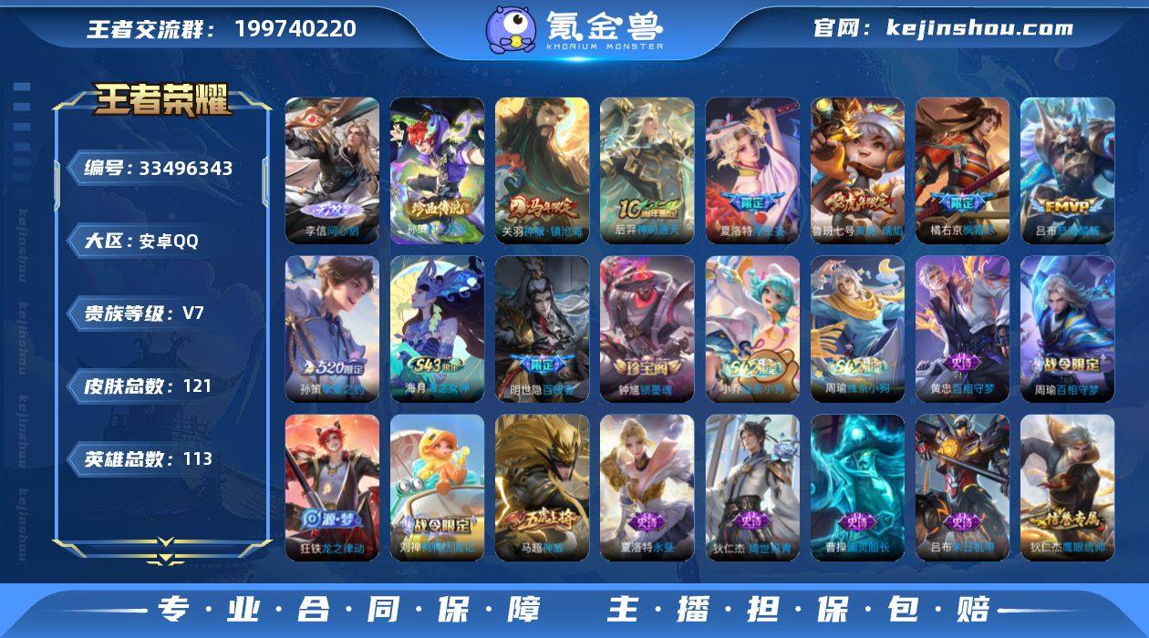 安卓Q-V7-永恒钻石I段位-113英雄-121皮肤-1无双-1珍品传说-7传说-33史诗 【英雄全皮】:孙权全皮,夏洛特全皮 【无双皮肤】:李信问心剑 【珍品传说】:孙策时之奇旅 【传说皮肤】:关羽神骥镇沧海,后羿神树通天,夏洛特浮生妄,吕布怒海麟威,橘右京枫霜尽,孙策挚爱之约,鲁班七号寅虎瑞焰 【限定皮肤】:狄仁杰阴阳师,赵云皇家上将,墨子神迹守卫,鲁班七号寅虎瑞焰,高渐离玩趣恶龙,狄仁杰魔术师,狄仁杰万华元夜,达摩沙漠行僧,项羽海滩派对,老夫子航海奇遇记,程咬金演武夺筹,兰陵王金庭之子,橘右京枫霜尽,李元芳云中旅人,钟馗驱傩正仪,雅典娜黎明之约,鬼谷子原初探秘者,苏烈千军破阵,百里玄策原初追逐者,梦奇顽趣,沈梦溪大漠名商,孙策挚爱之约,鲁班大师探海日志,桑启海盐诗旅,夏洛特浮生妄 【年限皮肤】:鲁班七号寅虎瑞焰 【赛季限定】:鬼谷子原初探秘者,狄仁杰万华元夜,程咬金演武夺筹,钟馗驱傩正仪,苏烈千军破阵,达摩沙漠行僧,兰陵王金庭之子,沈梦溪大漠名商,李元芳云中旅人,桑启海盐诗旅,鲁班大师探海日志,甄姬逆浪荇歌,百里玄策原初追逐者,雅典娜黎明之约,梦奇顽趣 【战令限定】:老夫子航海奇遇记,墨子神迹守卫,孙悟空神迹...
