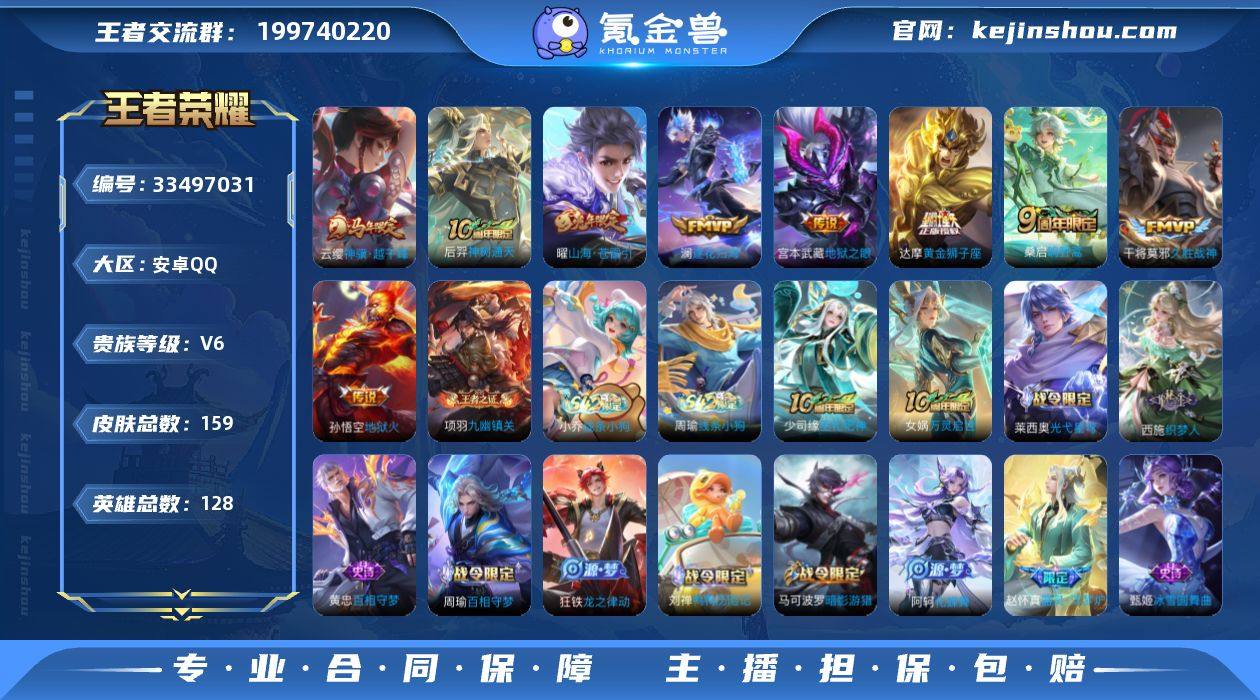 【男神打野带妹号·159皮9传说8按键·山海苍雷引·逐花归海】 安卓Q-V6-永恒钻石IV段位-128英雄-159皮肤-9传说-45史诗 【英雄全皮】:孙权全皮,敖隐全皮 【传说皮肤】:云缨神骥越千峰,后羿神树通天,桑启鸣野蒿,澜逐花归海,曜山海苍雷引,干将莫邪久胜战神,达摩黄金狮子座,宫本武藏地狱之眼,孙悟空地狱火 【限定皮肤】:姜子牙天穹之誓,狄仁杰阴阳师,赵云皇家上将,元歌无心,夏侯惇朔风刀,马可波罗暗影游猎,狄仁杰魔术师,狄仁杰万华元夜,项羽海滩派对,老夫子醍醐杖,程咬金演武夺筹,钟馗驱傩正仪,鬼谷子原初探秘者,百里玄策原初追逐者,裴擒虎李小龙,云中君纤云弄巧,猪八戒西部大镖客,曜山海苍雷引,艾琳女武神,鬼谷子天穹祈灯,沈梦溪龙舞盛年,刘邦剑破天穹,周瑜熔金海岸 【年限皮肤】:曜山海苍雷引 【赛季限定】:夏侯惇朔风刀,老夫子醍醐杖,鬼谷子原初探秘者,狄仁杰万华元夜,程咬金演武夺筹,钟馗驱傩正仪,鬼谷子天穹祈灯,刘邦剑破天穹,姜子牙天穹之誓,东皇太一噬灭天穹,太乙真人谧流熔炉,钟馗虚灵犬护,甄姬逆浪荇歌,亚瑟荣光之誓,百里玄策原初追逐者,项羽九幽镇关 【战令限定】:马可波罗暗影游猎,猪八戒西部大镖客,亚连破空之剑...