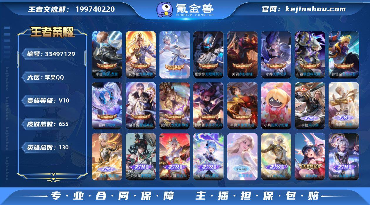 苹果Q-V10-至尊星耀I段位-130英雄-655皮肤-13典藏皮肤-1典藏英雄-12无双-5珍品传说-115传说-226史诗 【英雄全皮】:夏侯惇全皮,武则天全皮,关羽全皮,刘邦全皮,孙权全皮,花木兰全皮,不知火舞全皮,娜可露露全皮,橘右京全皮,孙悟空全皮,杨玉环全皮,女娲全皮,东皇太一全皮,鬼谷子全皮,大乔全皮,百里玄策全皮,裴擒虎全皮,狂铁全皮,李信全皮,伽罗全皮,盾山全皮,猪八戒全皮,嫦娥全皮,马超全皮,敖隐全皮,曜全皮,鲁班大师全皮,蒙恬全皮,澜全皮,夏洛特全皮,司空震全皮,金蝉全皮,莱西奥全皮,空空儿全皮,影全皮,海诺全皮 【荣耀典藏】:武则天英雄,孙悟空全息碎影,武则天倪克斯神谕,夏侯惇无限飓风号,小乔天鹅之梦,孙尚香杀手不太冷,芈月大秦宣太后,李白鸣剑曳影,诸葛亮星域神启,花木兰九霄神辉,关羽赤影疾锋,铠银白咏叹调,貂蝉幻阙歌,伽罗最初的交响 【无双皮肤】:李信问心剑,孙悟空无相,曜器灵螭龙剑,甄姬雪境奇遇,公孙离离恨烟,不知火舞花合斗,韩信群星魔术团,小乔时之魔女,李白碎月剑心,瑶真我赫兹,妲己青丘九尾,武则天神器明辉仪 【珍品传说】:伽罗沧流箭,嫦娥器灵落星盏,孙策时之奇旅,鲁班七号江户川柯南,马可波...