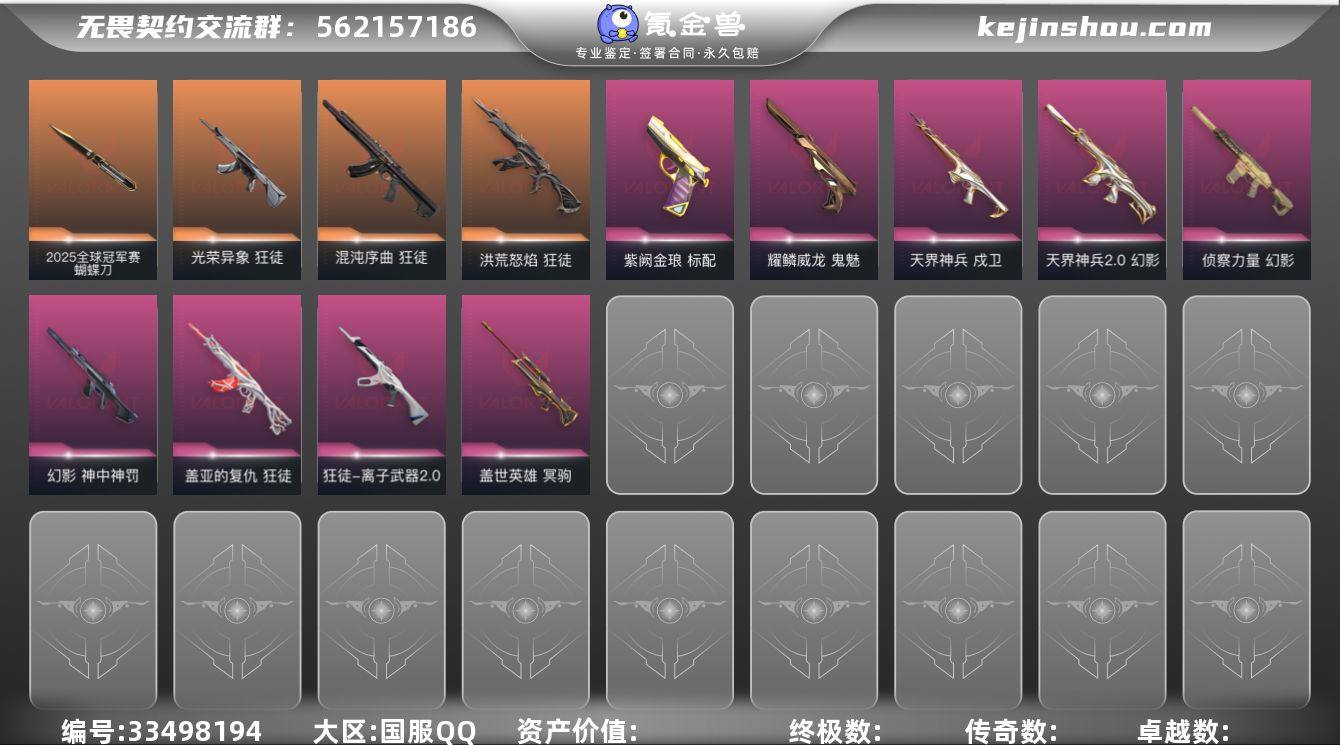 【套装】:2025全球冠军赛套装 【英雄】:幻棱,炼狱,维斯,暮蝶,钛狐,壹决,铁臂,捷风,雷兹,幽影,不死鸟,贤者,猎枭,蝰蛇,零,芮娜,奇乐,尚勃勒,霓虹,斯凯,夜露,星礈,K/O,盖可,黑梦,钢锁 【近战武器】:近战武器-2025全球冠军赛 蝴蝶刀,近战武器-紫金爪刀,近战武器-诡秘蛇影 军刀,近战武器-日耀风暴 遗器,近战武器-阿特拉斯指挥部 甩棍,近战武器-星际猎兵 短剑 【狂徒】:狂徒-2025全球冠军赛,狂徒-洪荒怒焰,狂徒-混沌序曲,狂徒-光荣异象,狂徒-千灵华绽//2.0,狂徒-盖亚的复仇,狂徒-离子武器//2.0,狂徒-诡秘蛇影 【幻影】:幻影-天界神兵//2.0,幻影-侦察力量,幻影-神中神罚,幻影-末日之翼 【戍卫】:戍卫-天界神兵,戍卫-折光棱晶 【冥驹】:冥驹-盖世英雄 【飞将】:飞将-末日之翼 【莽侠】:莽侠-RGX 11z Pro//3.0,莽侠-诡秘蛇影 【奥丁】:奥丁-末日之翼 【判官】:判官-诡秘蛇影 【蜂刺】:蜂刺-折光棱晶 【标配】:标配-紫阙金琅,标配-折光棱晶 【正义】:正义-奇点,正义-传奇制造 【鬼魅】:鬼魅-耀鳞威龙,鬼魅-诡秘蛇影 【短炮】:短炮-末日之翼 【卡面】:树懒大作战 卡面,无畏契约GO!第一卷:零 卡面,无垠星环 卡面,《双...