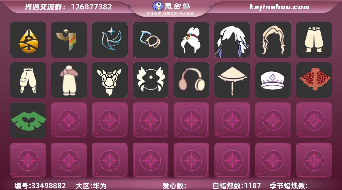 [18273205]华为 手机账号 1珍稀物品 5毕业季 2毕业图 1187蜡烛 【珍稀物品】彩虹围巾(五塑彩带斗) 【季节已毕业】归巢季,彩染季,青鸟季,双星季,迁徙季 【完成地图】晨岛,雨林 【礼包】暗彩装扮(彩虹武士裤),周年影院套餐礼包,橘子(大橘大利),兔子(玉兔头饰)(玉兔发饰)(兔子发饰),四叶草(四叶草头饰),新年耳钉(金鳞耳饰),围巾(小王子斗篷)(小王子围巾),青衫落拓礼包,献瑞折扇礼包 【裤子】武士裤,背带裤,搓澡巾 【面具】辉光羚羊面具 【面饰】青鸟毕业面饰(青鸟面饰),红耳机 【发型】飞天盘发(九色鹿丸子头),虚荣,归巢毕业发型(五塑彩羽发),若笠(箬笠) 【头饰】平顶帽,蓝色音乐会(蓝色音乐符) 【斗篷】青鸟毕业斗篷(青鸟斗篷),彩染围巾斗篷,绿芽,海洋斗 【配饰】雨伞