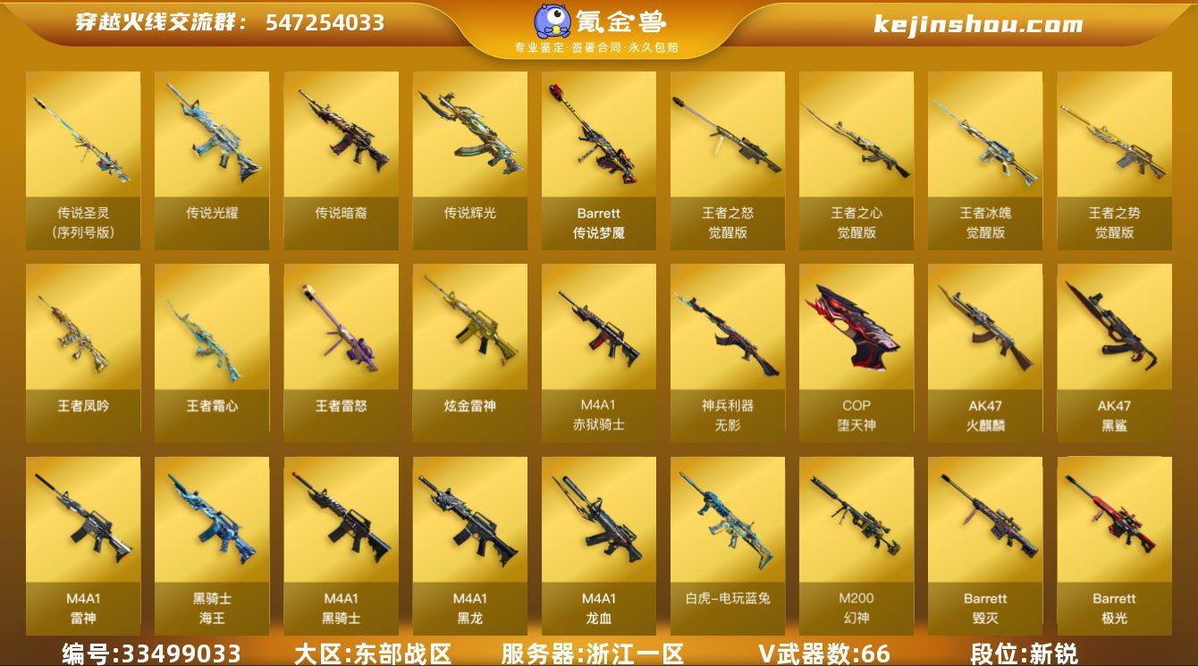浙江一区-76V-7王者武器数-1炫金武器数 【传说武器】:传说光耀(序列号版),传说圣灵(序列号版),传说光耀,传说暗裔,传说辉光,传说梦魇 【热门武器】:传说光耀,传说暗裔,传说梦魇,传说圣灵(序列号版),传说辉光,G36C-幻影,QBZ03-金色蔷薇,Scar Light-白虎,M200-幻神*2,M200-竞技荣光,白虎-电玩蓝兔,柯尔特-冠军之特,荣耀世冠-柯尔特,Kar98K-星神,金色小号,M4A1-黑骑士,加特林-炼狱*3,斯泰尔-蝴蝶,毁灭-孙三炮,火麒麟-绝迹,COP-白鲨*3,USP-雷暴,COP-堕天神,沙鹰-修罗*6,Knife-冠军之刃,金刚伞 【王者炫金武器】:王者凤吟,王者霜心,王者雷怒,炫金雷神 【音效卡】:屠龙-电竞之星-竞星跃动音效卡,M200-幻神音效卡*2,M4A1-雷神音效卡,M4A1-黑骑士音效卡,Barrett-毁灭音效卡,HK417-朱雀-电竞之星-竞星跃动音效卡,N9语音包 【皮肤】:M200-幻神-黄忠皮肤,幻神-周瑜皮肤,幻神-冠军之幻,幻神-宠儿-2021MVP,幻神-巅峰荣耀,幻神-电流骇客 皮肤,QBZ03-冠军之薇,雷神-荣耀之魄,雷神-星空,雷神-虎将,雷神-传奇N9,雷神-宠儿-2019MVP,雷神-R.LGD-CFPLS18冠军,AK47-火麒麟-传奇EVEN,火麒麟-轻羽皮肤,火麒麟-平天大圣,火麒麟-白虎...