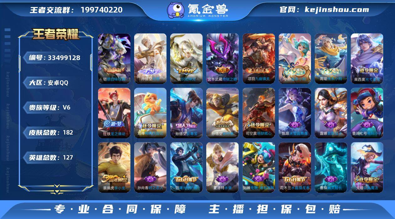 安卓Q-V6-永恒钻石II段位-127英雄-182皮肤-1典藏皮肤-1无双-2传说-51史诗 【英雄全皮】:戈娅全皮 【荣耀典藏】:铠银白咏叹调 【无双皮肤】:孙悟空无相 【传说皮肤】:镜炽阳神光,宫本武藏地狱之眼 【限定皮肤】:大乔绒语心约,姜子牙天穹之誓,杨戬破阵退雄兵,狄仁杰阴阳师,赵云皇家上将,孙尚香蔷薇恋人,扁鹊奇幻香踪,狄仁杰魔术师,狄仁杰万华元夜,项羽海滩派对,老夫子醍醐杖,程咬金演武夺筹,孙悟空至尊宝,孙悟空孙行者,李元芳云中旅人,钟馗驱傩正仪,杨戬潮玩骑兵,干将莫邪胡桃夹子,鬼谷子原初探秘者,弈星混沌棋,沈梦溪大漠名商,明世隐疑决卦,裴擒虎李小龙,裴擒虎擒涛扼浪,云中君纤云弄巧,西施玲珑珍味,鲁班大师探海日志,桑启海盐诗旅,戈娅驭风魔法,艾琳流音漫舞,司空震地狱燃心,张良古海寻踪,蒙犽百解令,蒙恬荣光圣徽,高渐离燃音魔法,妲己灵卜魔法,鬼谷子天穹祈灯,沈梦溪龙舞盛年,刘邦剑破天穹,程咬金群星魔术团,镜青焰无极,项羽苍威无极,周瑜熔金海岸 【赛季限定】:弈星混沌棋,明世隐疑决卦,老夫子醍醐杖,鬼谷子原初探秘者,狄仁杰万华元夜,程咬金演武夺筹,钟馗驱傩正仪,沈梦溪大漠名商,李元芳云中旅人,桑启海盐诗旅...