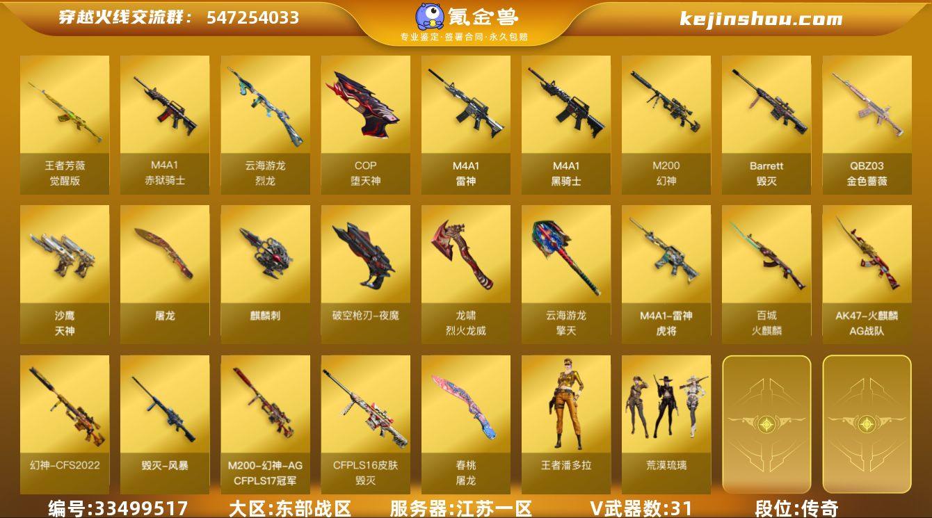 【ky6978】江苏一区-34V-2王者武器数-0炫金武器数 【热门武器】:QBZ03-金色蔷薇,M200-幻神,M4A1-黑骑士,COP-堕天神 【皮肤】:幻神-AG-CFPLS17冠军,幻神-CFS2022,雷神-虎将,雷神-源计划2.0专属 皮肤,火麒麟-AG战队皮肤,火麒麟-百城,毁灭-SV-CFPLS16冠军,毁灭-风暴,屠龙-春桃 皮肤 【角色】:荒漠琉璃,王者潘多拉,奇洋探员,乔伊教练,修道士,云海玲珑,风暴女,娟娟,灵狐者-黄金海岸,灵狐者-七夕宝贝,灵狐者-职业经理,龙儿-小淘气,麻雀,潘多拉-X,潘多拉-甜心教官,铁骑荣耀,影武者-X,职业选手 【人偶武器】:M37-葵,迷你深渊冰龙,迷你裂空之翼,夺魂,迷你艾比,灵狐娃娃手雷 【挑战大师】:冰龙粉碎者-白马银枪,VEPR-12-金魔*2 【英雄级武器】:M4A1-雷神,M4A1-黑骑士,QBZ03-金色蔷薇,王者芳薇-觉醒版,Barrett-毁灭,M200-幻神,炼狱-悦蓝-觉醒版,烈龙-云海游龙,沙鹰-天神*3,COP-堕天神,破空枪刃-夜魔,屠龙,马来剑-夜魔,麒麟刺,擎天-云海游龙,龙啸-烈火龙威,高爆手雷-夜魔*4,手雷-云海游龙,闪光弹-夜魔*4,烟雾弹-夜魔*4,烟雾弹-幻灵*2,M4A1-赤狱骑士 【其他武器】:源·火麒麟,魂·火麒麟-百城,魂·M4A1-雷神-化蛇,魂·雷神-诺...