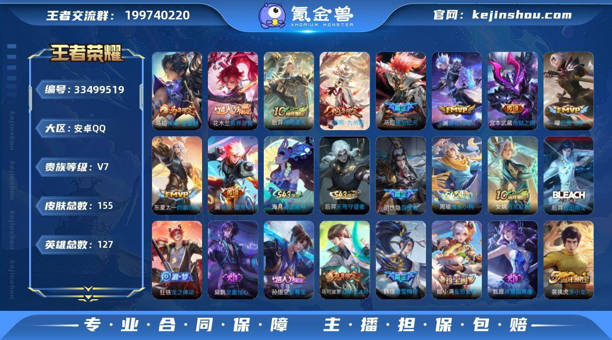 【男神打野带妹号·155皮10质量传说限定皮肤多·异界灵契·琥珀纪元·逐花归海】 安卓Q-V7-至尊星耀V段位-127英雄-155皮肤-10传说-45史诗 【英雄全皮】:影全皮 【传说皮肤】:马超神骥逐星野,花木兰异界灵契,后羿神树通天,澜愿照九州拓,马超琥珀纪元,澜逐花归海,东皇太一灼幽烈阳,澜电玩雷克斯,曜云鹰飞将,宫本武藏地狱之眼 【限定皮肤】:狄仁杰阴阳师,赵云皇家上将,高渐离玩趣恶龙,元歌无心,马可波罗山海玄木吟,狄仁杰魔术师,项羽海滩派对,韩信傲雪梅枪,兰陵王金庭之子,孙悟空至尊宝,李元芳匿光侦查者,李元芳云中旅人,鬼谷子五谷丰年,沈梦溪大漠名商,裴擒虎李小龙,裴擒虎擒涛扼浪,盾山梦圆繁星,嫦娥拒霜思,嫦娥暖冬兔眠,鲁班大师探海日志,桑启海盐诗旅,暃星界游侠,阿古朵江河有灵,张良古海寻踪,鬼谷子天穹祈灯,伽罗琥珀纪元,马超琥珀纪元,姬小满妄想食味,鲁班七号蔬乡物语,李元芳蔬乡物语,刘邦剑破天穹,周瑜熔金海岸 【年限皮肤】:马可波罗山海玄木吟,澜愿照九州拓 【赛季限定】:兰陵王金庭之子,沈梦溪大漠名商,李元芳云中旅人,桑启海盐诗旅,裴擒虎擒涛扼浪,鲁班大师探海日志,张良古海寻踪,鬼谷子天穹祈灯,刘邦剑破天穹,...