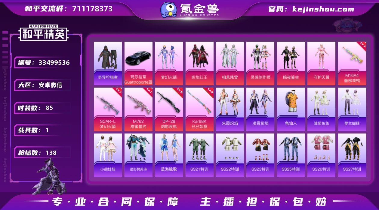 安卓 微信-6粉装-6特效枪-1载具-2粉色飞行器-44193热力值-8王牌印记-85套装-138枪皮 【热门品类】:粉装-梦幻火箭,套装-奇异狩猎者,套装-龟仙人 【粉色套装】:粉装-梦幻火箭,粉装-炙焰红王,粉装-相思残雪,粉装-灵感创作师,粉装-暗夜鎏金,角色-守护天翼 【粉色枪皮等级】:M16A4-垂柳戏鸭(七级),SCAR-L-梦幻火箭(七级),M762-甜蜜誓约(七级),Kar98K-巳巳如意(五级),DP-28-豹影疾电(五级),DP-28-鸢尾珑雾(四级) 【粉色载具】:玛莎拉蒂Quattroporte(夜幕蓝) 【粉色枪皮】:M16A4-垂柳戏鸭,SCAR-L-梦幻火箭,M762-甜蜜誓约,Kar98K-巳巳如意,DP-28-豹影疾电,DP-28-鸢尾珑雾 【粉色飞行器】:梦幻火箭飞行器,太空嘟嘟飞行器 【粉色降落伞】:梦幻火箭降落伞,甜蜜誓约降落伞,星之彼岸降落伞,相思残雪降落伞,垂柳戏鸭降落伞,灵感创作师降落伞,翩跹演武降落伞,金丰海韵降落伞,智耀战神降落伞,虹云熊熊降落伞 【稀有套装】:套装-龟仙人,套装-雪国风尚,套装-迅捷龙虾,套装-雏菊兔兔,套装-萝兰蝴蝶,套装-小熊娃娃,套装-星影赞美诗,套装-蓝海鲸歌,套装-朱霞炽焰,套装-凌霄紫焰,套装-雨过天青,套装-红釉青花,套装-燕雀桃枝 【稀有枪皮】:AKM-奇...