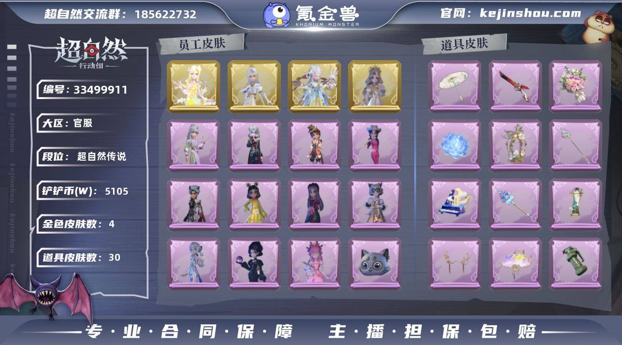 金色皮肤数量: 4 紫色皮肤数量: 11 道具皮肤数量: 30 段位: 超自然传说 员工: 逍遥,薇薇安,巫铃儿,莉莉,阿念,艾伦,小黄,零,爱丽丝,爱德华,兰,小满,临云 外观: 圣光之谕,丝缕哀歌,霓裳踏雪,素影瑶光,黑月挽歌,情公主,嘻嘻头套,烈焰红唇头套,呆滞头套,炙热烧烤,卑微头套,哈士奇头套,滑稽头套,鱼头怪头套,面具马头套,萨卡班甲鱼头套,云梦之星,天使的呼唤,在逃小新娘,小鲨包包,未竟乐园,天使消失的年代,呱呱雨衣,火爆了头套,惊魂南瓜,樱桃奶油布丁,雪墩墩头套,太空鲨头套,黎明猎手,耀眼的你,庆宴绮愿,晚安小熊,烛光纪念,瑶台梦,醉花阴,拂云仙,不朽的今夜,牛啤背包,剑仙,饺饺者头套,孤独对望,春之声,桂冠聆诗,侧耳倾听,梵卓之礼,蛋黄啵啵,煤球喵,万迭云华