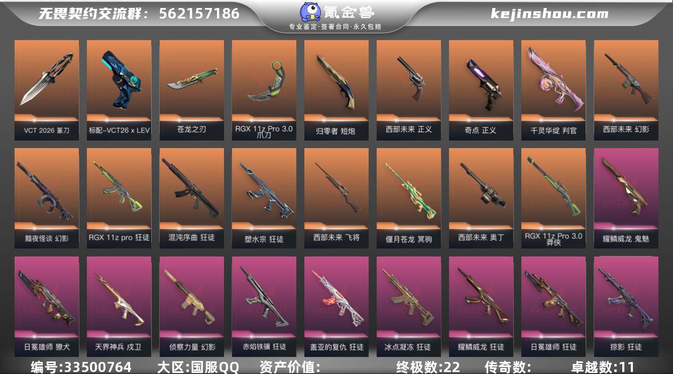 【套装】:VCT 2026 赛季套装,西部未来套装 【英雄】:幻棱,炼狱,维斯,暮蝶,钛狐,壹决,铁臂,捷风,雷兹,幽影,不死鸟,贤者,猎枭,蝰蛇,零,芮娜,奇乐,尚勃勒,霓虹,斯凯,夜露,星礈,K/O,海神,盖可,黑梦,钢锁 【近战武器】:近战武器-蒙太奇 战斧,近战武器-碎心裂刃,近战武器-VCT 2026 篆刀,近战武器-流风回雪,近战武器-5周年//公测重制版 苍龙之刃,近战武器-RGX 11z Pro//3.0 爪刀,近战武器-未来开拓者,近战武器-天御刀 【狂徒】:狂徒-混沌序曲,狂徒-塑水宗,狂徒-RGX 11z Pro,狂徒-冰点凝冻,狂徒-掠影,狂徒-盖亚的复仇,狂徒-日冕雄师,狂徒-耀鳞威龙,狂徒-赤焰铁骥 【幻影】:幻影-黯夜怪谈,幻影-西部未来,幻影-侦察力量,幻影-蒙太奇,幻影-西部未来 【戍卫】:戍卫-天界神兵 【獠犬】:獠犬-日冕雄师 【冥驹】:冥驹-偃月苍龙,冥驹-离子武器 【飞将】:飞将-西部未来 【莽侠】:莽侠-RGX 11z Pro//3.0 【战神】:战神-蒙太奇 【奥丁】:奥丁-西部未来 【判官】:判官-千灵华绽 【骇灵】:骇灵-蒙太奇 【标配】:标配-超能偶像 【VCT手枪】:标配-VCT26 x LEV 【正义】:正义-奇点,正义-西部未来,正义-超限闪存,正义-复古浪潮,正...