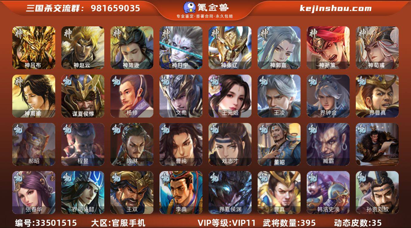 【JYSGS186】官阶:大将军 VIP等级:VIP11级 史诗武将数:49 动态皮肤数:35 武将总数:395 史诗宝珠数:0 元宝数:173 将魂数:5944 神吕布,神赵云,神陆逊,神甘宁,神张辽,神郭嘉,神孙策,神荀彧,杨修,王元姬,王凌,界钟会,界曹真,郝昭,陈琳,曹纯,戏志才,谋夏侯惇,程昱,马云騄,谋黄忠,谋夏侯氏,谋马超,周群,赵襄,张星彩,王平,沙摩柯,谯周,花鬘,吴景,孙皓,骆统,留赞,界朱然,界徐盛,界步练师,文鸯,左慈,张让,王允,麹义,祢衡,刘焉,界左慈,界李儒,公孙康,杜预,兀突骨,神周瑜,SP关羽,SP曹仁,SP蔡文姬,乐进,曹昂,诸葛诞,朱灵,文聘,SP姜维,张春华,钟会,曹冲,郭淮,满宠,界王异,界曹操,界司马懿,界夏侯惇,界张辽,界许褚,界郭嘉,李典,曹真,韩浩史涣,陈群,曹叡,曹休,钟繇,司马朗,王基,李通,郭皇后,孙资刘放,界甄姬,吕虔,鲁芝,蒯越蒯良,界典韦,界荀彧,界徐晃,杜畿,界曹丕,界邓艾,张恭,贾逵,界曹植,界曹彰,界满宠,界郭淮,卞夫人,界陈群,华歆,蔡贞姬,袁涣,王双,崔琰,毛玠,阮慧,谋徐晃,谋于禁,界夏侯渊,臧霸,唐咨,董昭,SP孙尚香,关银屏,夏侯霸,马良,关兴张苞,廖化,界马岱,关平,简雍,刘封,界法正,界关兴张苞,界刘备,界关羽,界张飞,界赵云,界马超,SP徐庶,吴懿,周仓,张松,刘谌,夏侯氏,糜竺,马忠,李严,黄皓...