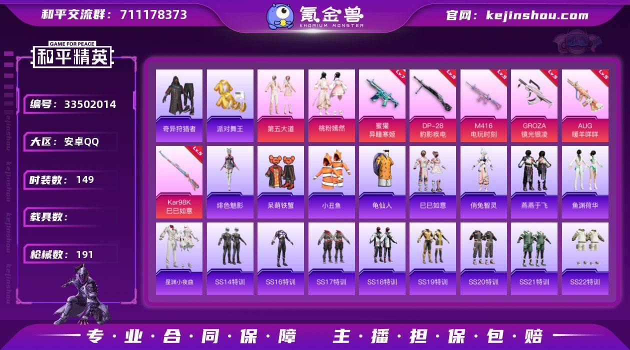【特价出售/店主推荐/21印记战神小号第五大道金鞋小丑鱼满级蜜獾精品公主号】安卓 手Q-无敌战神框-2粉装-12特效枪-0载具-3粉色飞行器-56042热力值-21王牌印记-149套装-191枪皮 【热门品类】:套装-派对舞王,套装-小丑鱼,套装-奇异狩猎者,套装-龟仙人 【粉色套装】:粉装-第五大道,粉装-桃粉嫣然 【粉色枪皮等级】:M416-电玩时刻(五级),GROZA-镜光银凌(五级),AUG-暖羊咩咩(五级),蜜獾-异瞳寒姬(七级),ACE32-萌骑漫游(五级),UMP45-萌骑冒险(四级),AKS-74U-森灵之息(四级),Kar98K-巳巳如意(五级),Mk14-福马献瑞(五级),AA12-G-萌骑幻想(四级),DP-28-豹影疾电(五级),PKM-萌骑夺宝(四级) 【粉色枪皮】:M416-电玩时刻,GROZA-镜光银凌,AUG-暖羊咩咩,蜜獾-异瞳寒姬,ACE32-萌骑漫游,UMP45-萌骑冒险,AKS-74U-森灵之息,Kar98K-巳巳如意,Mk14-福马献瑞,AA12-G-萌骑幻想,DP-28-豹影疾电,PKM-萌骑夺宝 【粉色飞行器】:炫彩糖果飞行器,闪光银龙飞行器,辉光之愿飞行器 【粉色降落伞】:风花雪月降落伞,暗夜鎏金降落伞,精灵梦叶罗丽降落伞,星梦奇缘降落伞,忍者神龟降落伞,月影灵韵降落伞,异瞳寒姬降落伞,炫彩糖果降落伞 【稀有套装】:套装-龟仙人,套装-...