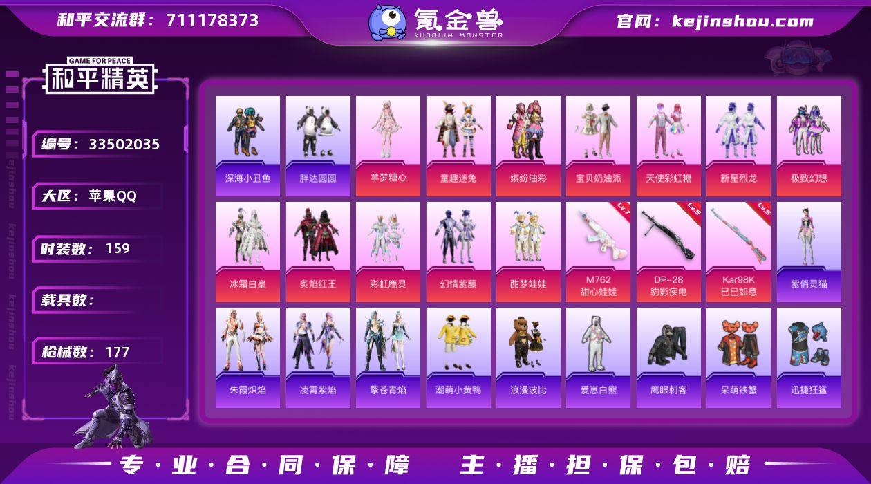 df苹果 【猪脸,深海小丑鱼,胖达,哥特红眼罩,浪漫波比,小白龙,国宝头盔熊猫】手Q-12粉装-5特效枪-0载具-1粉色飞行器-57918热力值-9王牌印记-159套装-177枪皮 【热门品类】:粉装-童趣迷兔,粉装-缤纷油彩,套装-浪漫天命,套装-深海小丑鱼,套装-小丑鱼,套装-胖达圆圆,套装-龟仙人,套装-潮萌小黄鸭,套装-暗影哥特,套装-浪漫波比,套装-粉红小猪 【粉色套装】:粉装-宝贝奶油派,粉装-天使彩虹糖,粉装-缤纷油彩,粉装-新星烈龙,粉装-极致幻想,粉装-冰霜白皇,粉装-童趣迷兔,粉装-炙焰红王,粉装-彩虹鹿灵,粉装-幻情紫藤,粉装-酣梦娃娃,角色-羊梦糖心 【粉色枪皮等级】:M762-甜心娃娃(七级),Kar98K-巳巳如意(五级),Mk14-福马献瑞(五级),DP-28-豹影疾电(五级),PKM-萌骑夺宝(五级) 【粉色枪皮】:M762-甜心娃娃,Kar98K-巳巳如意,Mk14-福马献瑞,DP-28-豹影疾电,PKM-萌骑夺宝 【粉色飞行器】:荧光虫舞飞行器 【粉色降落伞】:甜心宝贝降落伞,神秘黑猫降落伞,四圣焕新降落伞,夏日绵绵冰降落伞,童趣迷兔降落伞,蓝莓炮弹降落伞,甜心娃娃降落伞,旋转彩虹降落伞,异瞳寒姬降落伞 【稀有套装】:套装-龟仙人,套装-朱霞炽焰,套装-凌霄紫焰,套装-擎苍...