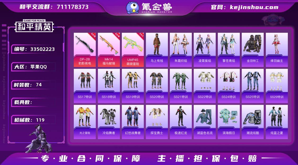 不可二次 苹果 手Q-无敌战神框-0粉装-3特效枪-0载具-1粉色飞行器-32223热力值-11王牌印记-74套装-119枪皮 QW2622511 【热门品类】:套装-金羽特工 【粉色枪皮等级】:UMP45-萌骑冒险(一级),Mk14-福马献瑞(四级),DP-28-豹影疾电(五级) 【粉色枪皮】:UMP45-萌骑冒险,Mk14-福马献瑞,DP-28-豹影疾电 【粉色飞行器】:炫彩糖果飞行器 【粉色降落伞】:环太平洋降落伞,旋转彩虹降落伞,星穹咏叹调降落伞,炫彩糖果降落伞 【稀有套装】:套装-马上有钱,角色-绛羽幽主,套装-朱霞炽焰,套装-凌霄紫焰,套装-擎苍青焰 【稀有枪皮】:AKM-星之彼岸,AKM-破晓战魂,AKM-虎虎生威,AKM-霓虹街区,AKM-龙的传人,M16A4-幻世战舞者,M16A4-甜心亚梦,M16A4-红色方程式,M16A4-蓝色火焰,SCAR-L-炫彩节奏,SCAR-L-玉兔迎春,SCAR-L-红色方程式,M416-红色方程式,M416-蓝色火焰,GROZA-异彩先驱,GROZA-田园牧歌,AUG-耀粉歌者,QBZ-彩虹符号,QBZ-飞驰魅影,M762-天降萌叽,M762-彩虹符号,M762-瑞龙福将,AC-VAL-天降萌叽,AC-VAL-甜心亚梦,蜜獾-天降萌叽,蜜獾-娇憨猪猪,ARX-凌霄紫焰,UZI-天降萌叽,UZI-娇憨猪猪,UZI-红色方程式,UMP45-涂山之恋,UMP45-生命誓言,UMP45-蓝色...