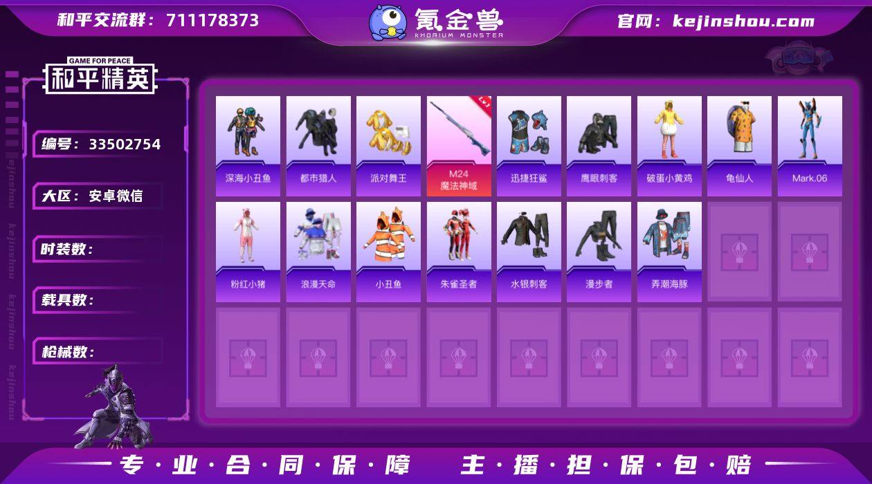 DSH2518【小雾神一套,派对舞王,蓝螳螂,小丑鱼】无二次安卓V-5稀有1粉装3特效枪13热门128套装173枪皮 49270热力值 8印记 历史传奇王牌20星 【5稀有】 AKM-缤纷海域 都市猎人 浪漫天命 派对舞王 派对舞王(金靴子) 【1粉装】 鸢尾珑雾 【3特效枪】 M24-魔法神域 (5级) Mk14-福马献瑞 (4级) ACE32-萌骑漫游 (4级) 【13热门】 Mark.06 小丑鱼 龟仙人 鹰眼刺客 迅捷狂鲨 深海小丑鱼 暗影哥特 粉红小猪 水银刺客 漫步者 朱雀圣者 破蛋小黄鸡 弄潮海豚 【2头盔】 深海小丑鱼头盔 甜蜜誓约头盔 营地ID:746898819
