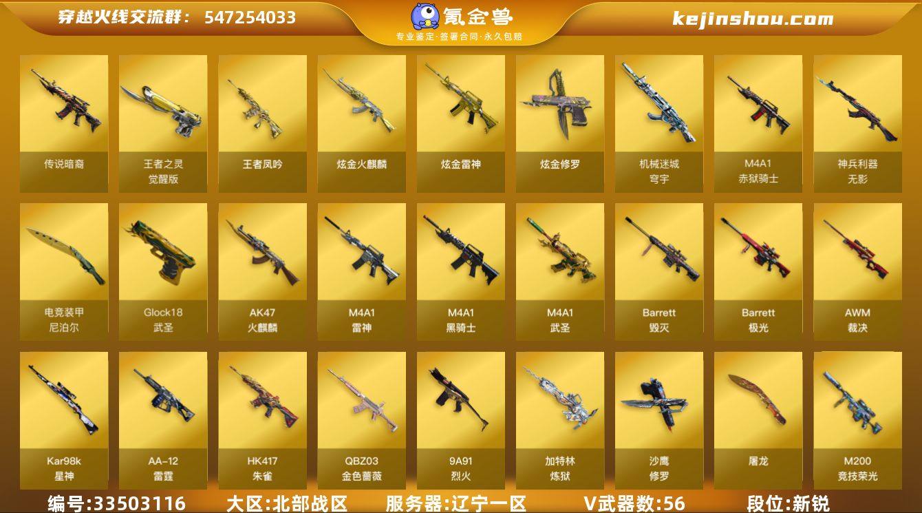 【ky6968】辽宁一区-60V-4王者武器数-3炫金武器数 【传说武器】:传说暗裔 【热门武器】:传说暗裔,QBZ03-金色蔷薇,HK417-朱雀,M200-竞技荣光,Kar98K-星神,M4A1-黑骑士,加特林-炼狱*2,裁决-雪莉杨*2,USP-雷暴,沙鹰-修罗 【王者炫金武器】:王者凤吟,王者之魄高爆手雷,炫金火麒麟,炫金雷神,炫金修罗 【音效卡】:M4A1-黑骑士音效卡,QBZ03-金色蔷薇音效卡,火线妹语音包 【皮肤】:星神-璀璨皮肤,金色蔷薇-枪娘阿敏 皮肤,雷神-暗月,雷神-荣耀之魄,雷神-烈虎皮肤,雷神-宇航兔皮肤,毁灭-魔灵皮肤,毁灭-直播专属,M4A1-千变-孔明皮肤,黑骑士-冠军之势,死神-机甲核心皮肤,极光-能量核心,屠龙-荣耀之锋,麒麟刺-萌杀皮肤 【角色】:雨棠,电竞教官-云悠悠,王者葵-惊若翩鸿,暗夜-X,暗夜审判,初恋灵狐,电竞少女,飞虎队-X,风暴女,嘉年华灵狐,灵狐-花神,灵狐者-X,灵狐者-职业经理,曼陀罗-X,萌儿,女主播,潘多拉-X,潜龙队-X,斯沃特-X,夜玫瑰-幻能朋克,游珑儿 【人偶武器】:裁决-雪莉杨*2,AWM-灵狐-15周年嘉年华,COP-旗袍,夺魂,生化手雷-机甲核心,灵狐娃娃手雷 【暴走生化】:超级对讲机 【挑战大师】:AK47-冰龙粉碎者,激光毁灭者III-...