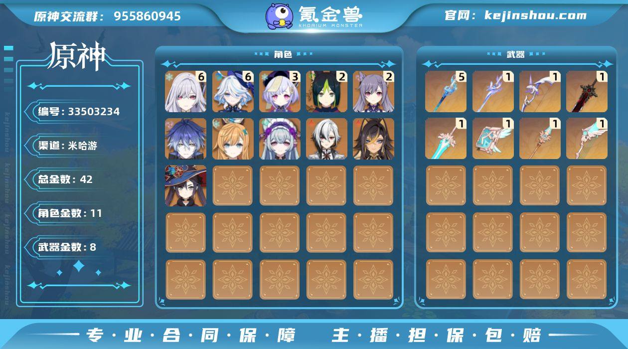 60级/42黄/女主/11个五星角色/8个五星武器 0命阿蕾奇诺,满命芙宁娜,0命迪希雅,2命提纳里,2命刻晴,3命七七,0命莫娜,0命梦见月瑞希,0命爱可菲,满命丝柯克,0命菲林斯,精5静水流涌之辉,精1天空之脊,精1天空之翼,精1阿莫斯之弓,精1天空之卷,精1狼的末路,精1天空之傲,精1苍耀