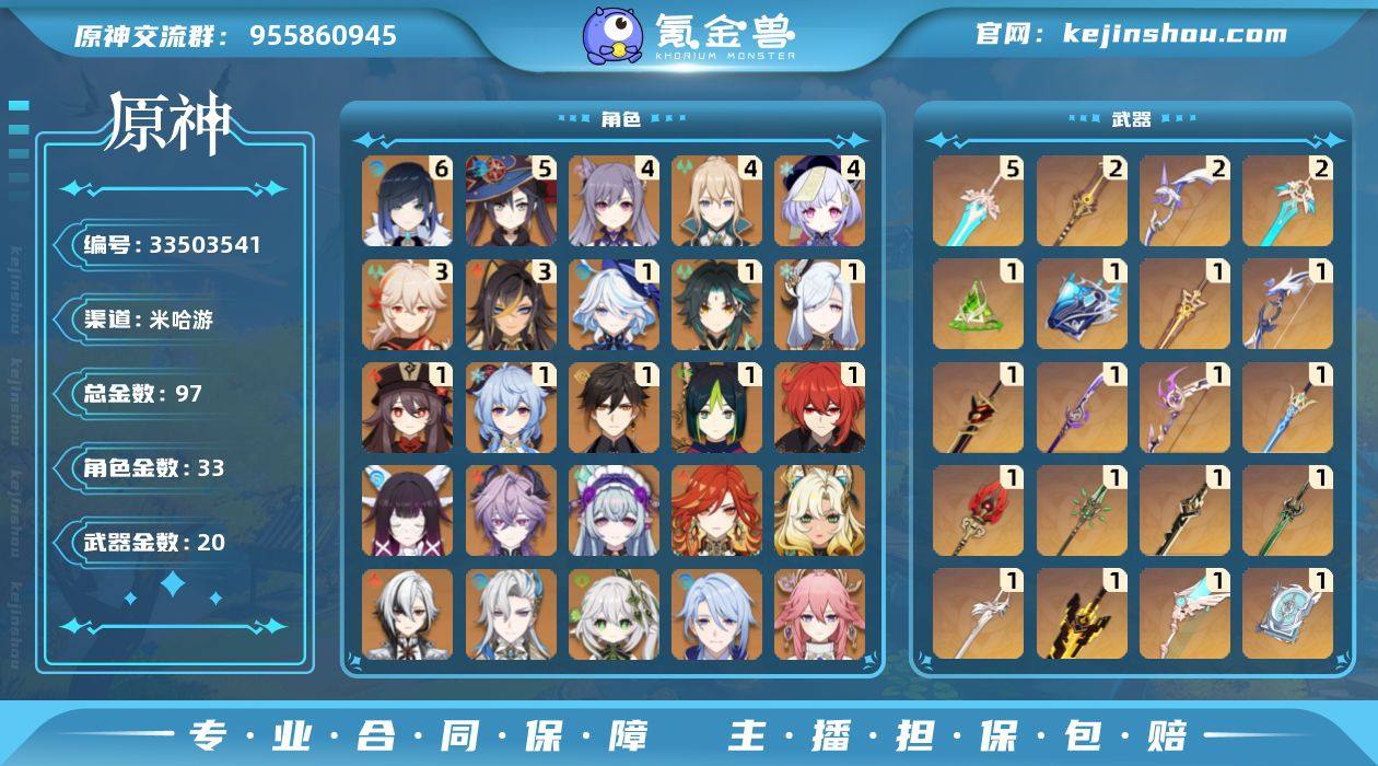 60级/97黄/女主/33个五星角色/20个五星武器 0命阿蕾奇诺,1命芙宁娜,0命那维莱特,3命迪希雅,0命纳西妲,1命提纳里,满命夜兰,0命神里绫人,0命八重神子,1命申鹤,0命优菈,0命雷电将军,3命枫原万叶,0命神里绫华,1命钟离,1命胡桃,1命甘雨,1命魈,0命宵宫,0命温迪,0命达达利亚,0命阿贝多,0命珊瑚宫心海,4命刻晴,4命七七,4命琴,5命莫娜,1命迪卢克,0命希诺宁,0命玛薇卡,0命梦见月瑞希,0命杜林,0命哥伦比娅,精1万世流涌大典,精2赤沙之杖,精1圣显之钥,精1若水,精1赤角石溃杵,精1薙草之稻光,精1飞雷之弦振,精1苍古自由之誓,精1无工之剑,精1护摩之杖,精1磐岩结绿,精1四风原典,精1和璞鸢,精1天空之翼,精2阿莫斯之弓,精2天空之刃,精1斫峰之刃,精1风鹰剑,精5天空之傲,精1真语秘匣