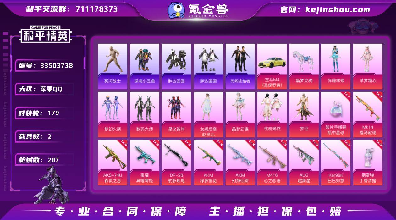 "XY665包人脸 苹果Q-4稀有2载具9粉装17特效枪22热门179套装287枪皮 90678热力值 16印记 历史绝世王牌17星 梦幻火箭 木乃伊 暗影哥特 天网终结者 SCAR-L-金蛇镇世 (3级) M416-墨龙九天 (3级) 破片手榴弹-瓶中星球 (7级) 百万伏特背包 萌熊伴侣背包 【4稀有】 木乃伊 AKM-缤纷海域 浪漫天命 天网终结者 【2载具】 宝马M4(圣保罗黄) 晶梦灵驹 【9粉装】 梦幻火箭 赵灵儿 异瞳寒姬 罗征 桃粉嫣然 羊梦糖心 晶梦幻蝶 数码大师 星之彼岸 【17特效枪】 SCAR-L-金蛇镇世 (3级) M416-心之恋语 (5级) M416-墨龙九天 (3级) AKS-74U-森灵之息 (5级) AKM-绿萝繁花 (5级) Kar98K-巳巳如意 (5级) AKM-幻海仙踪 (5级) M762-鬼刀 (4级) DP-28-豹影疾电 (5级) 蜜獾-异瞳寒姬 (5级) AUG-超新星 (5级) M16A4-晶梦幻蝶 (4级) Mk14-福马献瑞 (5级) ACE32-萌骑漫游 (4级) SCAR-L-青春物语 (3级) 破片手榴弹-瓶中星球 (7级) 烟雾弹-丁香清露 (5级) 【22热门】 小丑鱼 龟仙人 红熊茄茄 雪山精英 晶辉守护 呆萌铁蟹 鹰眼刺客 激萌罗小黑 迅捷狂鲨 深海小丑鱼 胖达圆圆 胖达团团 TEC追光队服 AG战队服 暗影哥特 狂沙舞者 漫步者 破蛋小黄鸡 军刀雅典娜 弄潮海豚 M762-奇异狩猎者 M24-奇异狩猎者...