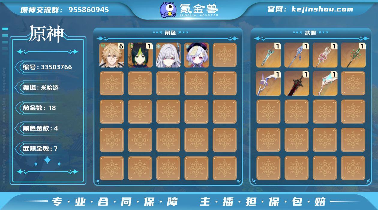 56级/18黄/女主/4个五星角色/7个五星武器 1命提纳里,0命七七,0命丝柯克,满命法尔伽,精1和璞鸢,精1天空之翼,精1阿莫斯之弓,精1狼的末路,精1香韵奏者,精1血染荒城,精1狼的武功歌