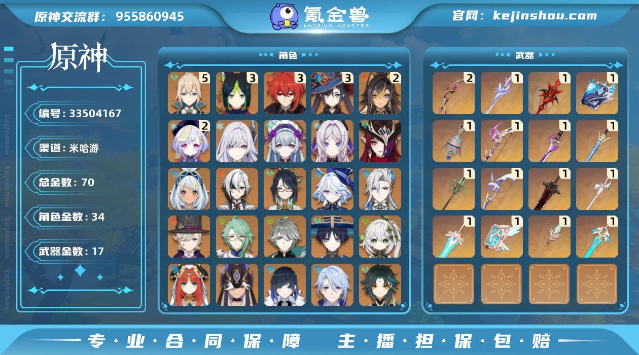 60级/70黄/女主/34个五星角色/17个五星武器 0命阿蕾奇诺,0命闲云,0命芙宁娜,0命那维莱特,0命林尼,0命白术,2命迪希雅,0命艾尔海森,0命流浪者,0命纳西妲,0命妮露,0命赛诺,3命提纳里,0命夜兰,0命神里绫人,0命荒泷一斗,0命优菈,0命雷电将军,0命枫原万叶,0命神里绫华,0命钟离,0命胡桃,0命魈,0命宵宫,0命可莉,2命七七,5命琴,3命莫娜,3命迪卢克,0命玛拉妮,0命恰斯卡,0命茜特菈莉,0命梦见月瑞希,0命丝柯克,精1赤月之形,精1万世流涌大典,精2最初的大魔术,精1图莱杜拉的回忆,精1飞雷之弦振,精1雾切之回光,精1苍古自由之誓,精1和璞鸢,精1天空之脊,精1阿莫斯之弓,精1天空之刃,精1天空之卷,精1风鹰剑,精1狼的末路,精1天空之傲,精1苍耀