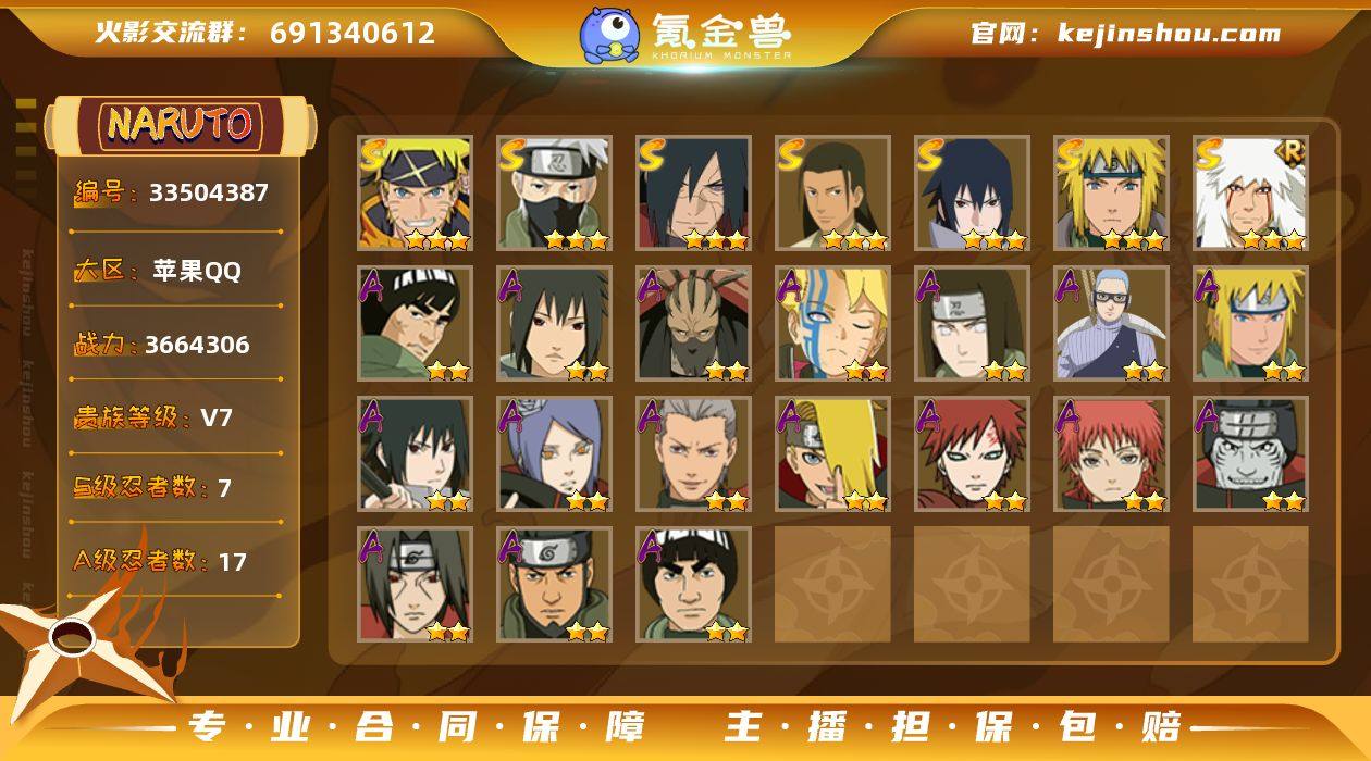 IOS/7S忍/17A忍/战力366W/V7/区服716 【S忍者】 宇智波佐助「漩涡鸣人」,宇智波斑「秽土转生·解」,千手柱间「木叶创立」,宇智波佐助「永恒万花筒」,自来也「舞之豪杰」,旗木卡卡西「须佐能乎」,波风水门, 【A忍者】 迈特凯「青春爆炸」,长十郎「六代目水影」,日向宁次「忍界大战」,漩涡博人「桃式显现」,蝎「绯流琥」,宇智波泉奈,波风水门「青年」,宇智波佐助「须佐能乎」,小南,飞段,迪达拉,我爱罗「疾风传」,蝎,干柿鬼鲛,宇智波鼬,猿飞阿斯玛,迈特凯, PX_2505439