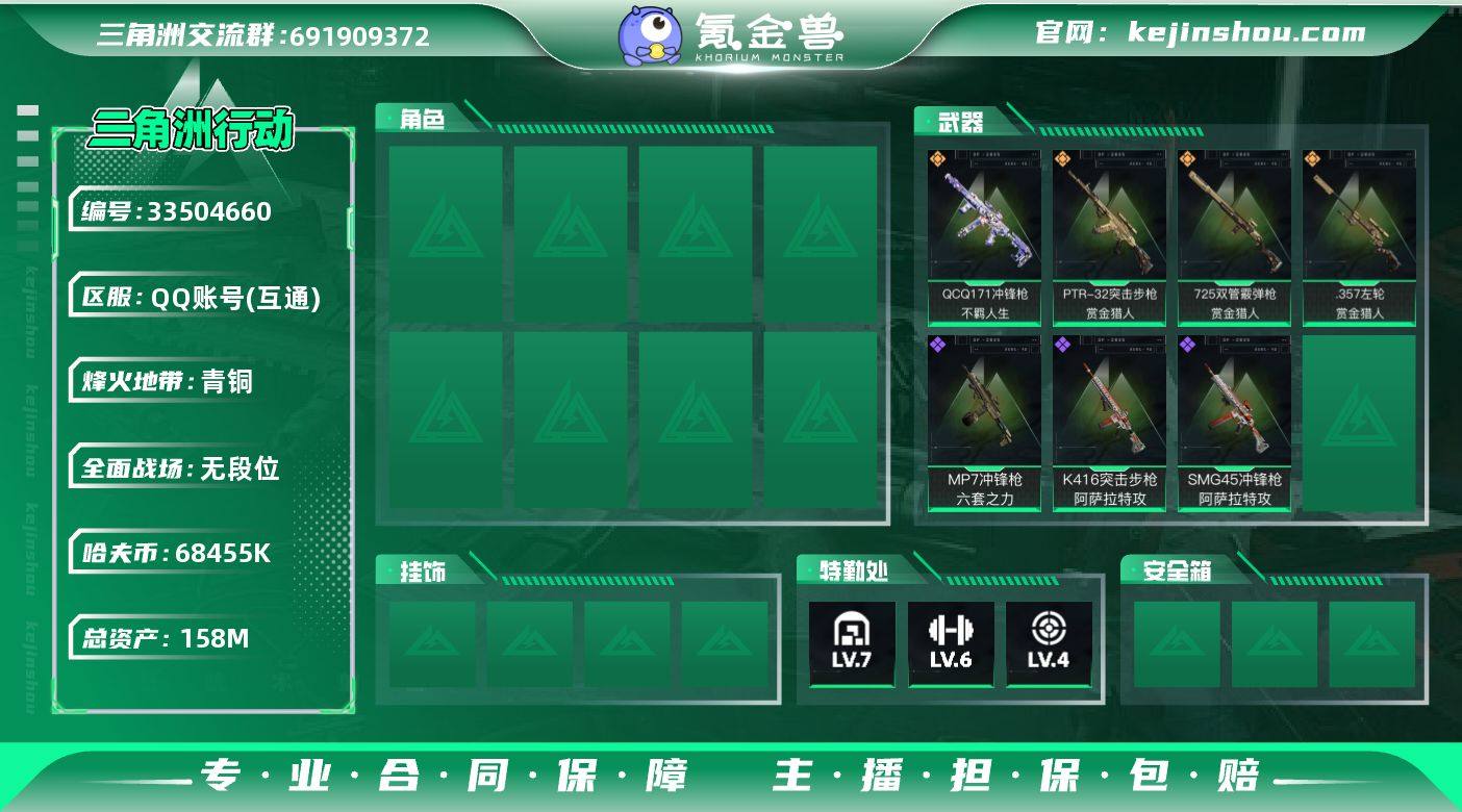 【958364】158m总资产-68455k哈夫币-60烽火等级-青铜-1战场等级-无军衔 【近战皮肤】:近战-黑鹰 【传说外观】:PTR-32突击步枪-赏金猎人,QCQ171冲锋枪-不羁人生,725双管霰弹枪-赏金猎人,.357左轮-赏金猎人 【史诗外观】:K416突击步枪-阿萨拉特攻,SMG-45冲锋枪-阿萨拉特攻,MP7冲锋枪-六套之力 【稀有外观】: AK-12突击步枪-马年新春,SCAR-H战斗步枪-荣耀列队,SMG-45冲锋枪-行动开启,SMG-45冲锋枪-幻影结构,QJB201轻机枪-哈夫克卫队,G18-星链科技,G18-哈夫克航天 【普通外观】:QBZ95-1突击步枪-高雅黑,腾龙突击步枪-三角洲力量,K416突击步枪-高雅黑,M16A4突击步枪-出货,M7战斗步枪-红色涂装,M7战斗步枪-黑巧甜心,SG552突击步枪-浅蓝涂装,SG552突击步枪-狂欢,CAR-15突击步枪-狂欢,AS Val突击步枪-黑巧甜心,Vector冲锋枪-几何迷彩,UZI冲锋枪-海色,M1014霰弹枪-高雅黑,M1014霰弹枪-重击,杠杆式步枪-出货,PKM通用机枪-出货,QJB201轻机枪-典雅,SR-25射手步枪-黄蜂,SR9射手步枪-出货,沙漠之鹰-海浪 【挂饰】:挂饰-悬赏令,挂饰-麻将*11