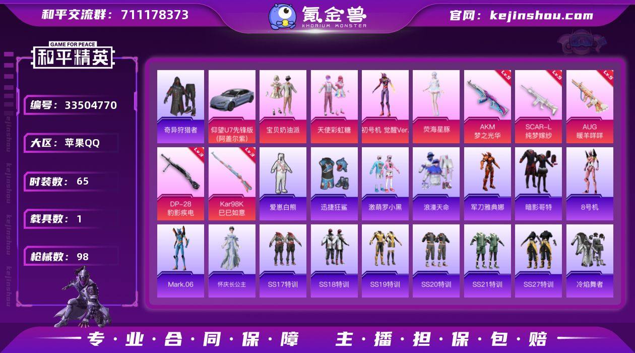 【男神身法号·觉醒螳螂·浪漫天命·哥特·仰望U7·地铁有天赋】苹果 手Q-4粉装-5特效枪-1载具-0粉色飞行器-32383热力值-4王牌印记-65套装-98枪皮 【热门品类】:套装-浪漫天命,套装-奇异狩猎者,角色-军刀雅典娜,套装-暗影哥特,角色-8号机,角色-Mark.06 【粉色套装】:粉装-宝贝奶油派,粉装-天使彩虹糖,角色-初号机 觉醒Ver.,角色-荧海星豚 【粉色枪皮等级】:AKM-梦之光华(五级),SCAR-L-纯梦嫁纱(五级),AUG-暖羊咩咩(五级),Kar98K-巳巳如意(三级),DP-28-豹影疾电(三级) 【粉色载具】:仰望U7(阿盖尔紫) 【粉色枪皮】:AKM-梦之光华,SCAR-L-纯梦嫁纱,AUG-暖羊咩咩,Kar98K-巳巳如意,DP-28-豹影疾电 【粉色降落伞】:甜心宝贝降落伞,蓝莓炮弹降落伞,筑梦精灵降落伞,炙焰牛王降落伞,环太平洋降落伞,暗夜鎏金降落伞,初号机 觉醒Ver.降落伞,忍者神龟降落伞,鸢尾珑雾降落伞 【稀有套装】:套装-遗迹猎人,角色-怀庆长公主,角色-枫露凝珀,角色-皓月伶影,套装-燕雀桃枝 【稀有枪皮】:AKM-奇异狩猎者,AKM-彩虹符号,AKM-环太平洋,AKM-破晓战魂,M16A4-幻世战舞者,M16A4-甜心亚梦,SCAR-L-红色方程式,M416-红色方程式,M416-兴海奇遇,GROZA-异彩先驱,AUG...