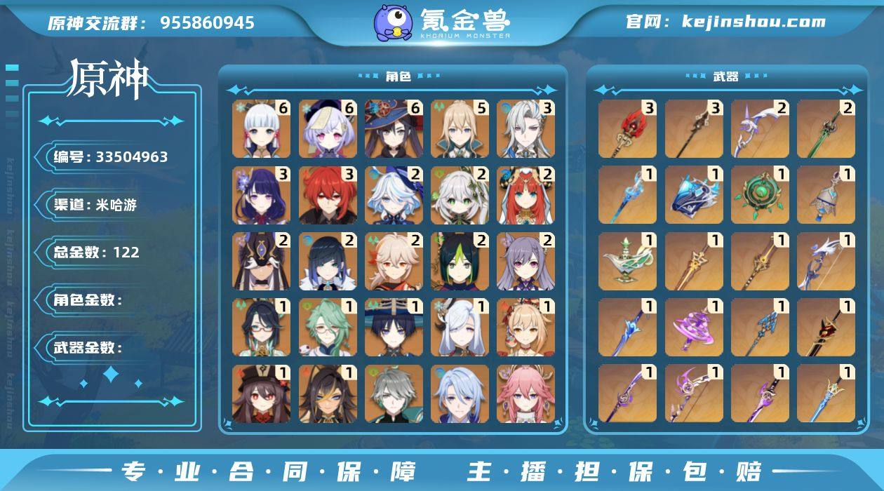 【原神】3满命,冒险等级:60,五星数量:61,五星角色:莫娜 * 6命,七七 * 6命,神里绫华 * 6命,琴 * 5命,那维莱特 * 3命,迪卢克 * 3命,雷电将军 * 3命,芙宁娜 * 2命,枫原万叶 * 2命,刻晴 * 2命,夜兰 * 2命,提纳里 * 2命,赛诺 * 2命,妮露 * 2命,纳西妲 * 2命,白术 * 1命,迪希雅 * 1命,闲云 * 1命,胡桃 * 1命,宵宫 * 1命,申鹤 * 1命,流浪者 * 1命,珊瑚宫心海,温迪,优菈,钟离,荒泷一斗,达达利亚,八重神子,神里绫人,艾尔海森,甘雨__五星武器:护摩之杖 * 3精,贯虹之槊 * 3精,阿莫斯之弓 * 2精,磐岩结绿 * 2精,碧落之珑,万世流涌大典,静水流涌之辉,图莱杜拉的回忆,苍古自由之誓,飞雷之弦振,风鹰剑,和璞鸢,狼的末路,四风原典,天空之傲,无工之剑,雾切之回光,薙草之稻光,终末嗟叹之诗,赤角石溃杵,冬极白星,息灾,神乐之真意,波乱月白经津,若水,猎人之径,赤沙之杖,圣显之钥,千夜浮梦__四星角色:班尼特 * 6命,行秋 * 6命,九条裟罗 * 6命,香菱 * 6命,久岐忍 * 6命,鹿野院平藏 * 6命,珐露珊 * 6命,凝光 * 6命,迪奥娜 * 6命,砂糖 * 6命,米卡 * 6命,坎蒂丝 * 6命,多莉 * 6命,柯莱 * 6命,芭芭拉 * 6命,云堇 * 6命,早柚 * 6命,托马 * 6命,五郎 * 6命,烟绯 * 6命,重云 * 6命,辛焱 * 6命,诺艾尔 *...