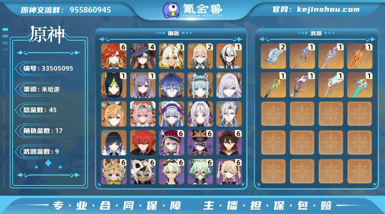 邮箱: 送网易邮箱 总黄数: 45 冒险等级: 59 6命金色角色: 满命玛薇卡 4命金色角色: 四命莫娜 3命金色角色: 三命希诺宁 2命金色角色: 二命琴 1命金色角色: 一命刻晴,一命提纳里,一命阿蕾奇诺 0命金色角色: 迪卢克,夜兰,那维莱特,茜特菈莉,梦见月瑞希,瓦雷莎,爱可菲,丝柯克,伊涅芙,菲林斯 拥有武器: 天空之翼,四风原典,天空之刃,若水,岩峰巡歌,焚曜千阳,苍耀,血染荒城 2精武器: 四风原典 1精武器: 天空之翼,天空之刃,若水,岩峰巡歌,焚曜千阳,苍耀,血染荒城