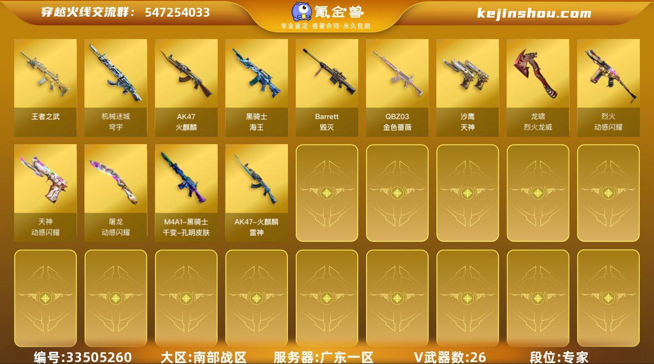 【C5580】广东一区-27V-1王者武器数-0炫金武器数 【热门武器】:QBZ03-金色蔷薇 【王者炫金武器】:王者之武 【皮肤】:火麒麟-雷神,毁灭-百城浙江 皮肤,毁灭-英雄计划 皮肤,M4A1-千变-孔明皮肤,极光-能量核心 【角色】:乔伊教练,炽天使,嘉年华灵狐,娟娟,0号玩家,麻雀,潘多拉-X,潜龙队-X,邱刚敖,斯沃特-X,蜀雪,雪莉杨,夜玫瑰-宠粉,樱-战斗天使 【人偶武器】:AWM-灵狐-15周年嘉年华,迷你牛魔王,迷你波特博士,生化手雷-机甲核心*2,灵狐娃娃手雷 【暴走生化】:超级对讲机 【挑战大师】:激光毁灭者III-白马银枪,神圣爆裂者-末日III 【英雄级武器】:AK47-火麒麟,QBZ03-金色蔷薇,烈火-动感闪耀,黑骑士-海王,机械迷城-穹宇,Barrett-毁灭,沙鹰-天神,天神-动感闪耀,屠龙-动感闪耀,龙啸-烈火龙威,手雷-动感闪耀 【源级武器】:源-千变,火麒麟-雷神,魂·雷神-诺拉,魂·雷神-维纳斯,魂·雷神-新春神龙,魂-雷神-萌杀,魂·雷神-15周年嘉年华,御·雷神-机甲刑天,御·雷神-烈虎,M4A1-十二生肖·龙-雷神,御·雷神-葫芦兄弟,源·黑骑士,魂·黑骑士-现代金属,魂·黑骑士-幻能朋克,魂·黑骑士-破浪10年,御·黑骑士-冰魄,御·黑骑士·哪吒闹海,源·无影,魂·...