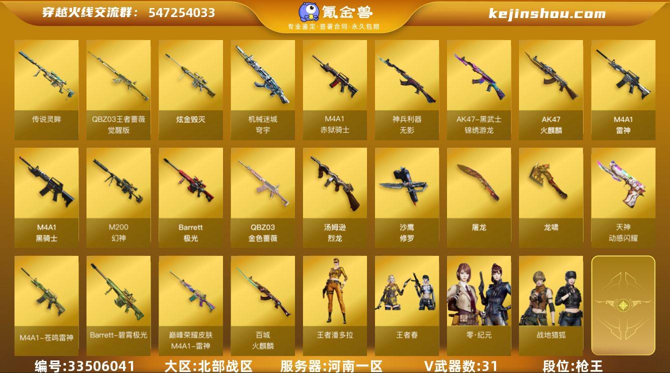 【C5190】河南一区-34V-1王者武器数-1炫金武器数 【传说武器】:传说灵眸 【热门武器】:传说灵眸,QBZ03-金色蔷薇,M4A1-青龙,M200-幻神,M4A1-黑骑士*2,汤姆逊-烈龙*6,沙鹰-修罗*2 【王者炫金武器】:炫金毁灭 【音效卡】:M4A1-黑骑士音效卡,Barrett-碧霄极光音效卡,AWM-昌龙-怀旧音效卡 【皮肤】:M4A1-雷神-巅峰荣耀皮肤,火麒麟-百城 【角色】:零·纪元,战地猎狐,王者春,王者潘多拉,乔伊教练,修道士,云海玲珑,暗夜-X,风暴女,虎妞,嘉年华灵狐,娟娟,兰-新年限定,灵狐者-X,灵狐者-七夕宝贝,灵狐者-职业经理,麻雀,曼陀罗-X,潘多拉-X,兔囡囡,维纳斯 【人偶武器】:斯泰尔-枪娘暗刃,AWM-灵狐-15周年嘉年华 【挑战大师】:神圣爆裂者-末日III 【英雄级武器】:AK47-火麒麟,M4A1-雷神,M4A1-黑骑士*2,M4A1-青龙,无影-神兵利器,黑武士-锦绣游龙,QBZ03-金色蔷薇,QBZ-03-王者蔷薇-觉醒版,机械迷城-穹宇,Barrett-极光,M200-幻神,汤姆逊-烈龙*6,沙鹰-修罗*2,天神-动感闪耀,屠龙,龙啸,高爆手雷-幻灵,手雷-动感闪耀,手雷-云海游龙,闪光弹-幻灵,烟雾弹-幻灵,M4A1-赤狱骑士,M4A1-苍鸣雷神,Barrett-碧霄极光 【道具】:BS战队炫彩背包,...