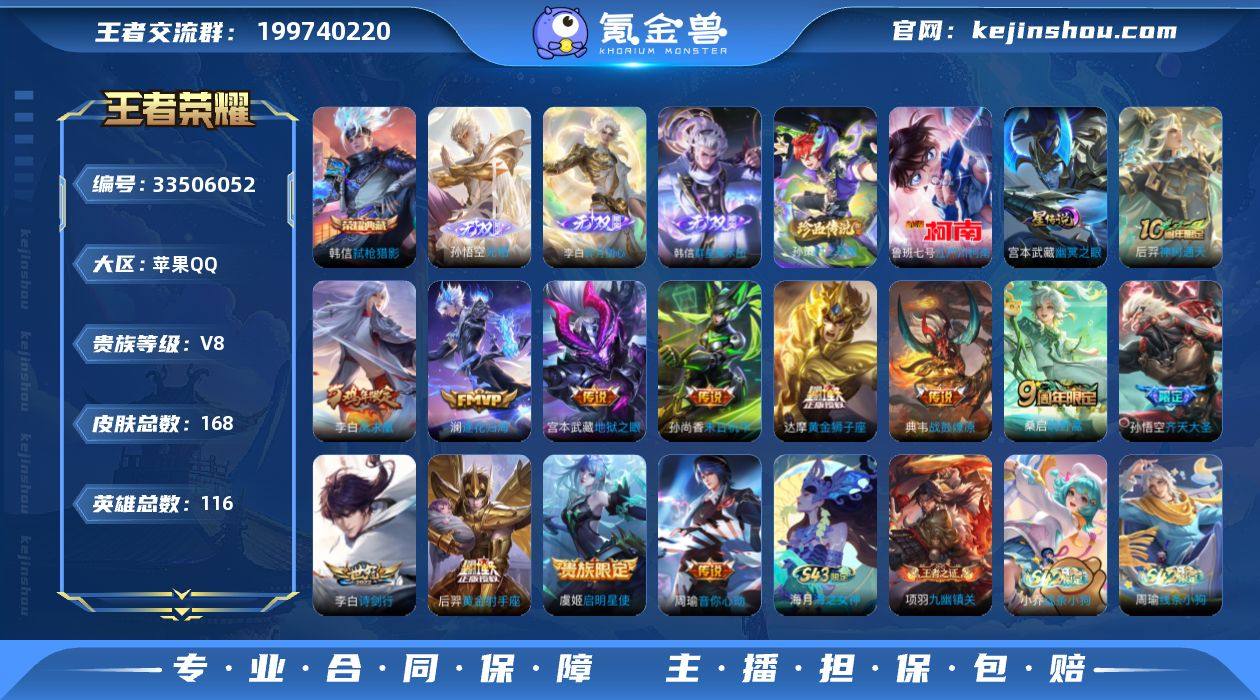 【店长推荐·弑枪猎影·无相·群星魔术团·碎月剑心·孙策时之奇旅·江户川柯南·逐花归海·财神纳福天幕·冰锋战神·至尊宝·无二次包过】YXw23896-苹果Q-116英雄-168皮肤-5王者印记-80铭文-贵族积分5w【贵族8】【1典藏·3无双·2珍品·1星传说·13传说·1天幕·13按键】【因赛季更新游戏段付以上号为准!】 【荣耀典藏】:韩信弑枪猎影 【无双皮肤】:孙悟空无相,韩信群星魔术团,李白碎月剑心 【珍品传说】:孙策时之奇旅,鲁班七号江户川柯南 【星元皮肤】:宫本武藏幽冥之眼 【天幕】:财神纳福天幕 【传说皮肤】:后羿神树通天,桑启鸣野蒿,典韦战鼓燎原,澜逐花归海,孙悟空齐天大圣,李白诗剑行,周瑜音你心动,虞姬启明星使,达摩黄金狮子座,后羿黄金射手座,李白凤求凰,孙尚香末日机甲,宫本武藏地狱之眼 【限定皮肤】:李白谪仙醉月,狄仁杰阴阳师,赵云皇家上将,赵云百木心枪,孙尚香蔷薇恋人,元歌无心,狄仁杰魔术师,项羽海滩派对,关羽冰锋战神,韩信傲雪梅枪,孙悟空至尊宝,孙悟空大圣娶亲,孙悟空齐天大圣,李元芳云中旅人,虞姬启明星使,鬼谷子五谷丰年,黄忠烈魂,沈梦溪大漠名商,裴擒虎李小龙,鲁班大师探海日志,桑启海盐诗旅,李白碎月剑心,沈梦溪龙舞盛年,韩...